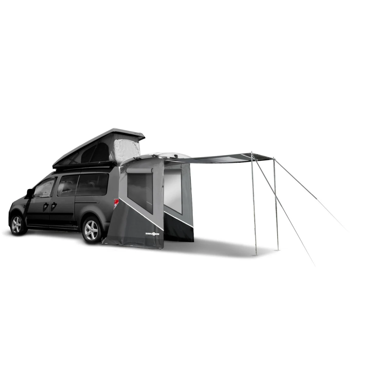 Das rahmenlose Brunner Pilote Caddy 5 Heckklappenzelt ist passend für den VW Caddy 5 und wird mit Gurten direkt an der Heckklappe befestigt. Somit erweiterst du dein Fahrzeug, um einen komfortablen Ess- oder Stauraum. Die Seiten werden regendicht am Fahrzeug fixiert und im unteren Bereich wird das Pilote Caddy 5 dicht am Wagen abgespannt. Die außenliegenden Faulstreifen lässt große Wassermengen weit abfließen. Die Frontwand lässt sich hochrollen oder kann als Sonnendach, mit den im Lieferumfang enthaltende Aufstellstangen, aufgestellt werden. Die beiden großen Gazefenster an der rechten Seitenwand und in der Frontwand ermöglichen dir einen sehr guten Luftdurchzug.