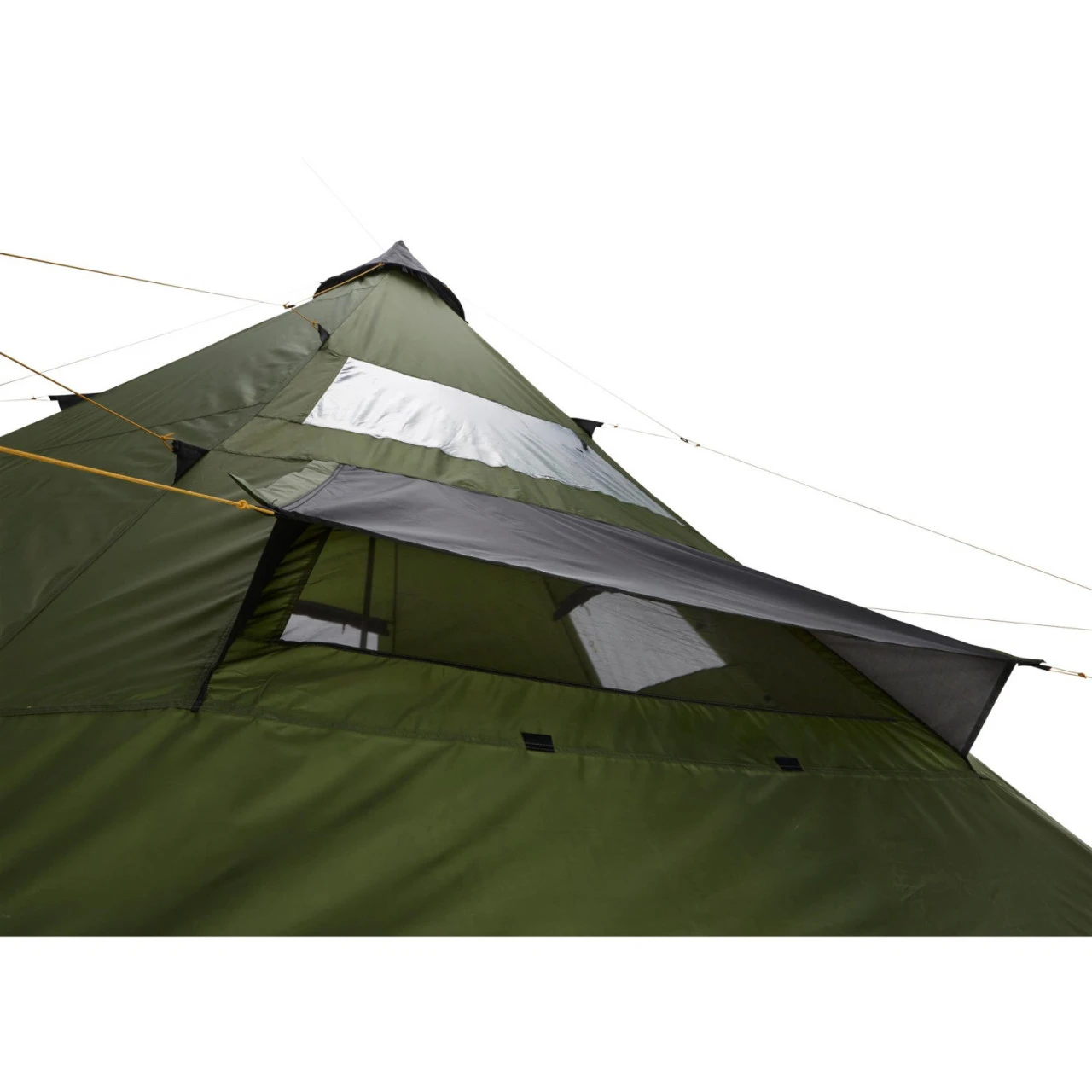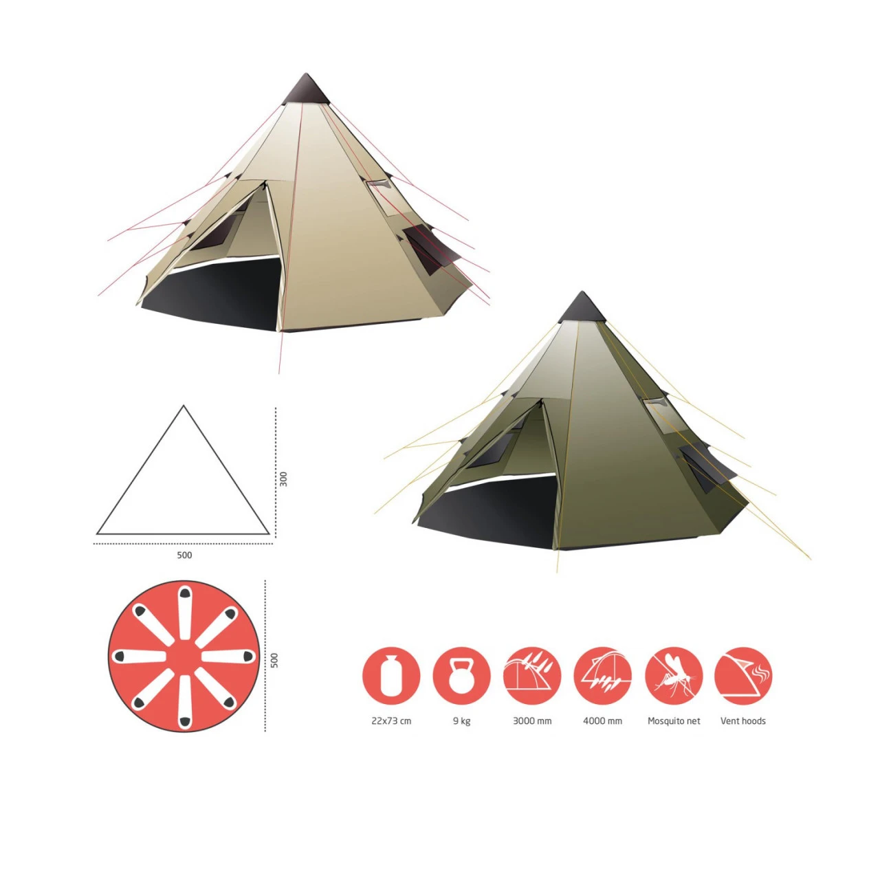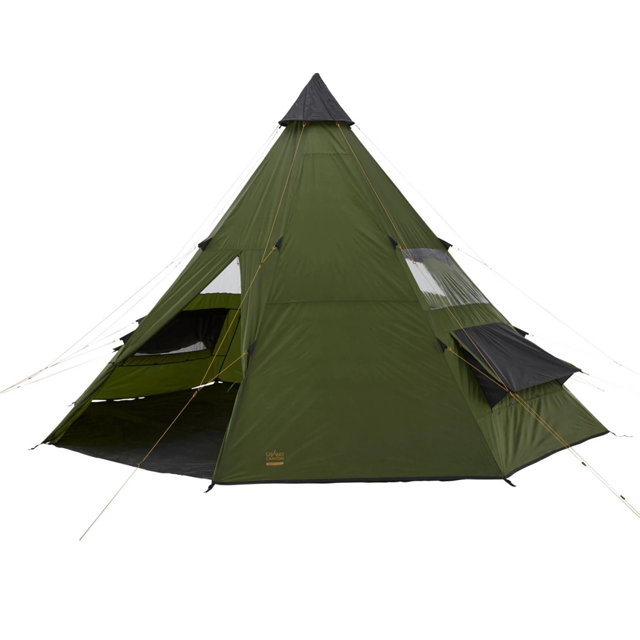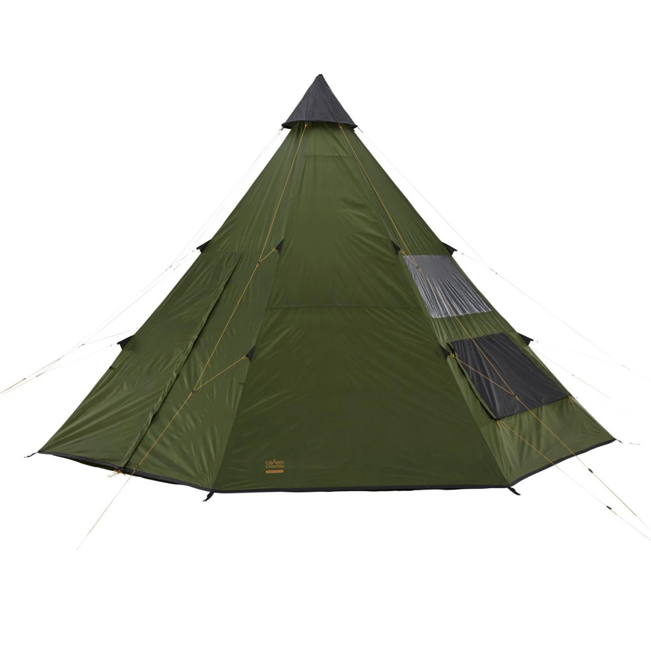 Das Grand Canyon Black Falls 8 Tipizelt ist das optimale Gruppenzelt für Abenteurer. Es bietet insgesamt Raum zum Schlafen für bis zu acht Personen oder kann tagsüber zum Zusammensitzen für größere Gruppen genutzt werden. Der traditionelle Tipi-Stil schafft eine Atmosphäre von Gemeinschaft und Geselligkeit, durch die runde Grundfläche. Innovativ an diesem Modell sind die eingearbeiteten Fenster, die viel Licht ins Innere strömen lassen und außerdem das Belüftungssystem komplettieren. Das leichte Material unterstützt den ohnehin unkomplizierten Auf- und Abbau des Black Falls 8, der ohne große Anstrengung innerhalb weniger Minuten geleistet werden kann. Die optional verwendbare Bodenplane hält Nässe und Schmutz von Dir fern.