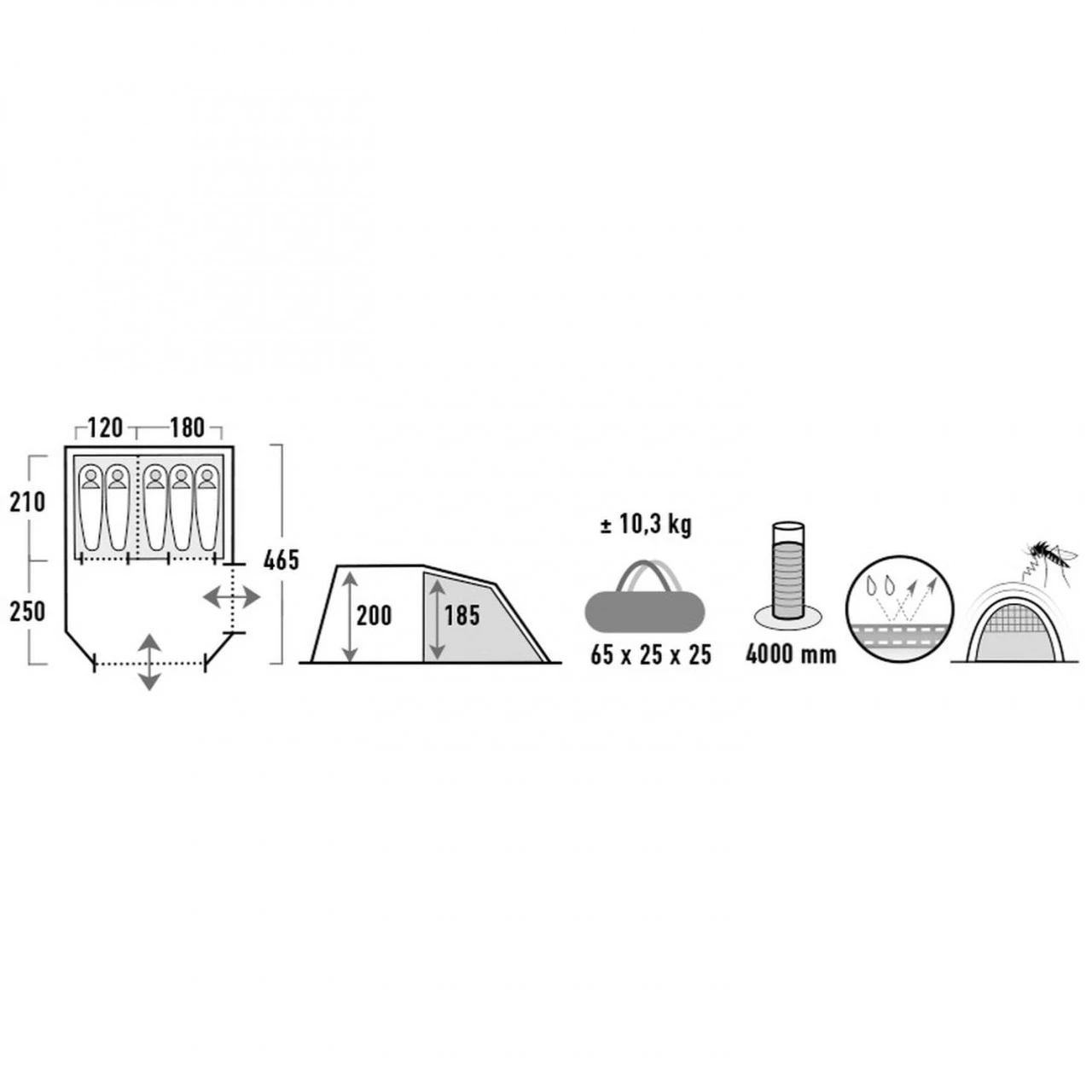 Das High Peak Ancona 5.0 Familienzelt bietet jede Menge Platz. Innenzelt und Vorraum mit Stehhöhe lassen dich das Zelte im vollen Maße ausnutzen. Das High Peak Ancona 5.0 ist mit 2 ausgetüftelten Vario Vent Control Eingängen ausgestattet. Sie lassen sich bequem von innen mittels Reißverschlüssen variabel bedienen. Ein großes Gazefenster bringt Frischluft und kann, wenn es ungemütlich wird, einfach mit der Abdeckklappe verschlossen werden. Die Abdeckklappe lässt man einfach in eine Tasche fallen. Bei geschlossener Abdeckklappe sind zusätzlich 2 Dauerventilationen für die Luftzirkulation vorhanden. Die abgedunkelte Schlafkabine kann durch eine Trennwand in zwei separate Kabinen unterteilt werden und gewährt angenehmen Schlaf auch nach dem Aufgehen der Sonne. Im Lieferumfang ist ein Zeltboden für den Wohnbereich inklusive. Der PE-Boden hat eine Wassersäule von 10.000 mm und kann bei Bedarf herausgenommen werden.