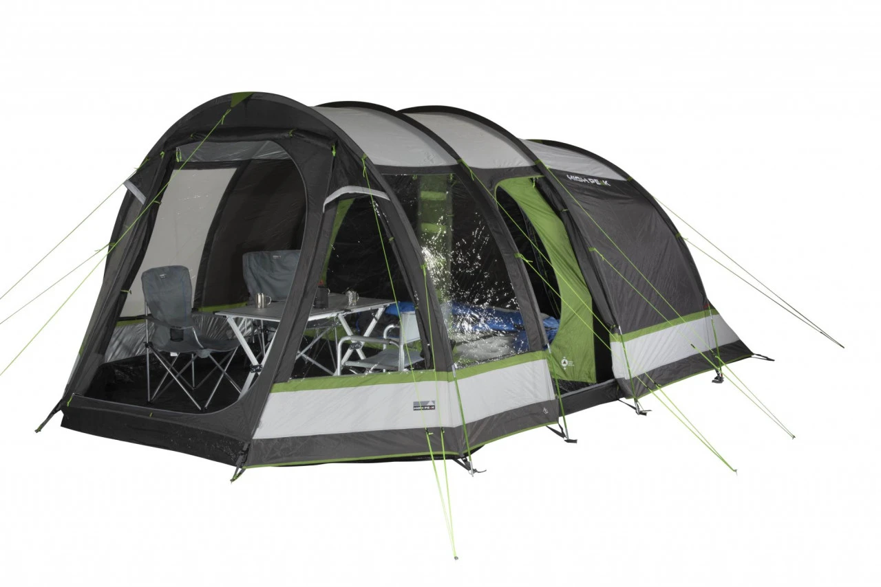 Das High Peak Bozen 6.0 Familienzelt im Tunneldesign gehalten, bietet 6 Personen Platz und überzeugt mit vielen praktischen Features. In das Innere des Zeltes gelangst Du durch die Front- oder Seitentür. Beide Eingänge sind mit Mesh ausgestattet, sodass keine Insekten in Dein Zelt gelangen können. Im Inneren Deines Zeltes hast Du einen großen Wohnraum, der Dir viel Platz zum Kochen, Spielen und Entspannen bietet. Durch die Klarsichtfolienfenster kommt viel Licht in Dein Zelt. Möchtest Du hingegen mehr Privatsphäre genießen, kannst Du die Gardinen vorziehen. Außerdem verfügt das Bozen 6.0 über zwei abgedunkelte Schlafkabinen. Die beiden Schlafkabinen sind mit einer Reißverschluss-Trennwand voneinander getrennt. Möchtest Du einen großen Schlafraum haben, kannst Du die Trennwand herauszippen. Für einen besseren Schlafkomfort sind die Schlafkabinen mit zwei Vario Vent Control Eingängen mit Meshfenstern ausgestattet. Die Meshfenster können bei Bedarf geschlossen werden. Im Innenzelt befinden sich an den Seitenwänden Innentaschen. Dort kannst Du Zeitschriften oder Ähnliches verstauen. Zu den weiteren Ausstattungsmerkmalen des Bozen 6.0 gehören eine Lampenhalterung, eine Dauerventilation, verstellbare Spanngurtbänder, ein rolldown Packsack mit Kompressionsgurten und eine Positionsmarkierung, die das Einhängen des Außenzeltes erleichtert.