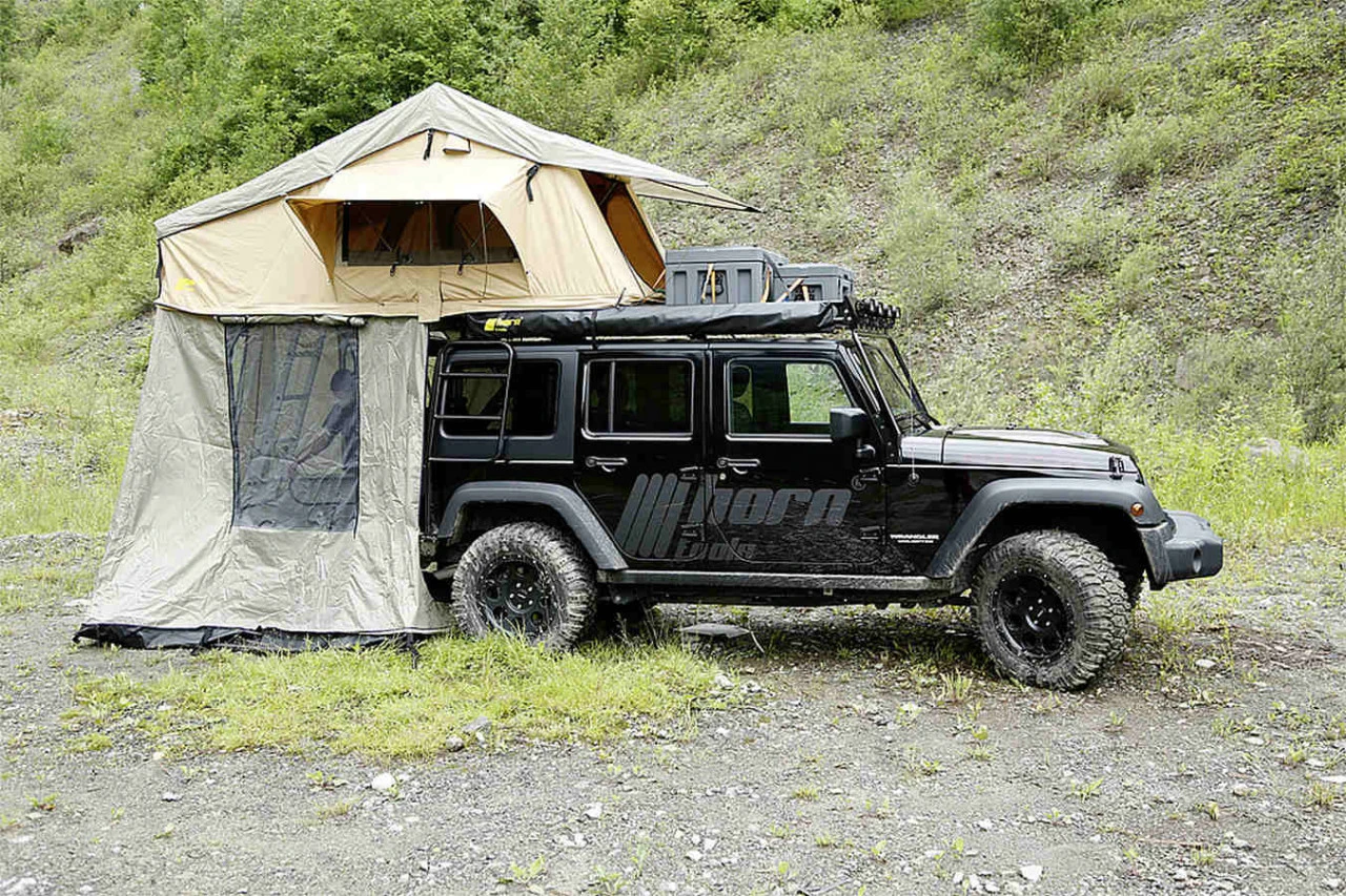 Das horntools GmbH Dachzelt Desert I 140 cm eignet sich perfekt für zwei Personen, die bei ihrem Abendteuerurlaub auf nichts verzichten möchten. Es passt für fast alle Fahrzeuge, vom kleinen VW Polo bis zum Land Rover Defender. Durch das hochwertige Segeltuchgewebe (Baumwollmischgewebe) ist das Dachzelt besonders atmungsaktiv und ein Überdacht aus Polyester sorgt für einen Schutz vor Regen. In das Innere des Zeltes gelangst du durch den Einstieg von unten, sodass du vor Wind und Wetter bestens geschützt bist. Das Zelt verfügt über drei Fenster, die seitlich geschlossen werden können. Darüber hinaus sind sie mit Moskitonetzen ausgestattet, sodass du einen ruhigen und angenehmen Schlaf hast. Des Weiteren verfügt das Dachzelt Desert I 140 cm über einen robusten, wasserdichten Gummi-Innenboden, den du bei Bedarf auch herausnehmen kannst. Das Vorzelt ist mit einem YKK Reißverschluss in 3 Minuten am Dachzelt befestigt. Im Lieferumfang enthalten sind: Dachzelt + Abdeckung, Regenüberzug, Vorzelt + Innenboden, 80 mm Matratze, Dachträger-Befestigungsmaterial, Werkzeug für den Aufbau, Spannstangen für die Ausstellfenster, Abspannschnüre und Karabiner, Bedienungs- und Pflegeanleitung!