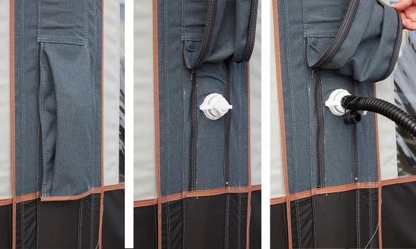 Die Stabilität des Air Cirrus North Wohnwagenvorzelts wird durch eine straffe und gut durchdachte Luftkonstruktion mit 3 Aufblas- bzw. Ablassventilen gewährleistet. Zum Aufblasen benötigst du lediglich einen Aufblaspunkt deiner Wahl. Eine besonders starke Handpumpe mit zwei verschiedenen Hubkammern wird serienmäßig mitgeliefert, um das Aufblasen und Feinjustieren der Luftschlauchstärke zu erleichtern. Jeder Luftkanal kann durch das einfach zu bedienende Verriegelungssystem On/Off separat abgedichtet werden, was maximale Sicherheit bietet. Zur Abdichtung an den Wohnwagen sind zwei zusätzliche Luftschleusen vorhanden, die je nach Wohnwagenform separat aufgeblasen werden können, um sich optimal an Ihren Wohnwagen anzupassen.