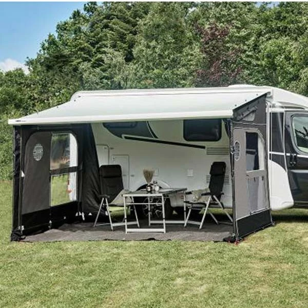Du kannst die Isabella Buddy Frontseite einfach in den Keder deiner Markisenblende einziehen. Es spielt keine Rolle, ob du eine Markise von Thule, Fiamma oder Dometic besitzt. Wenn du die Buddy Seitenteile hinzufügst, kannst du ein komplettes Markisenvorzelt oder auch nur einen Teil davon gestalten. Die großen Fenster an der Front ermöglichen einen ungehinderten Ausblick auf deine Umgebung. Außerdem können die Fenster an der Buddy-Front mit Hilfe der Reißverschlüsse abgeklappt werden. Dadurch kannst du eine Verandalösung mit der im Lieferumfang enthaltenen Verandastange gestalten. Die Frontteile sind in vier verschiedenen Breiten erhältlich und eignen sich für Markisen ab drei Metern.
