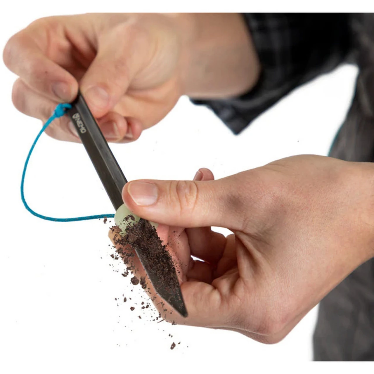 Die Sweepstake Heringe von Nemo Equipment sind aus leichtem Aluminium gefertigt. Mit ihren 18 cm Länge sind sie so lang, dass sie dein Zelt auch bei stärken Winden halten. Jeder Hering hat einen Kunststoffring befestigt. Dieser Kunststoffring ist eine Selbstreinigungshülse, mit der du nach dem Campen den Dreck aus dem Hering herausschieben kannst. Außerdem ist der Kunststoffring fluoreszierend, so dass er im Dunkeln leuchtet und keiner über den Hering oder die Abspannleine stolpert.