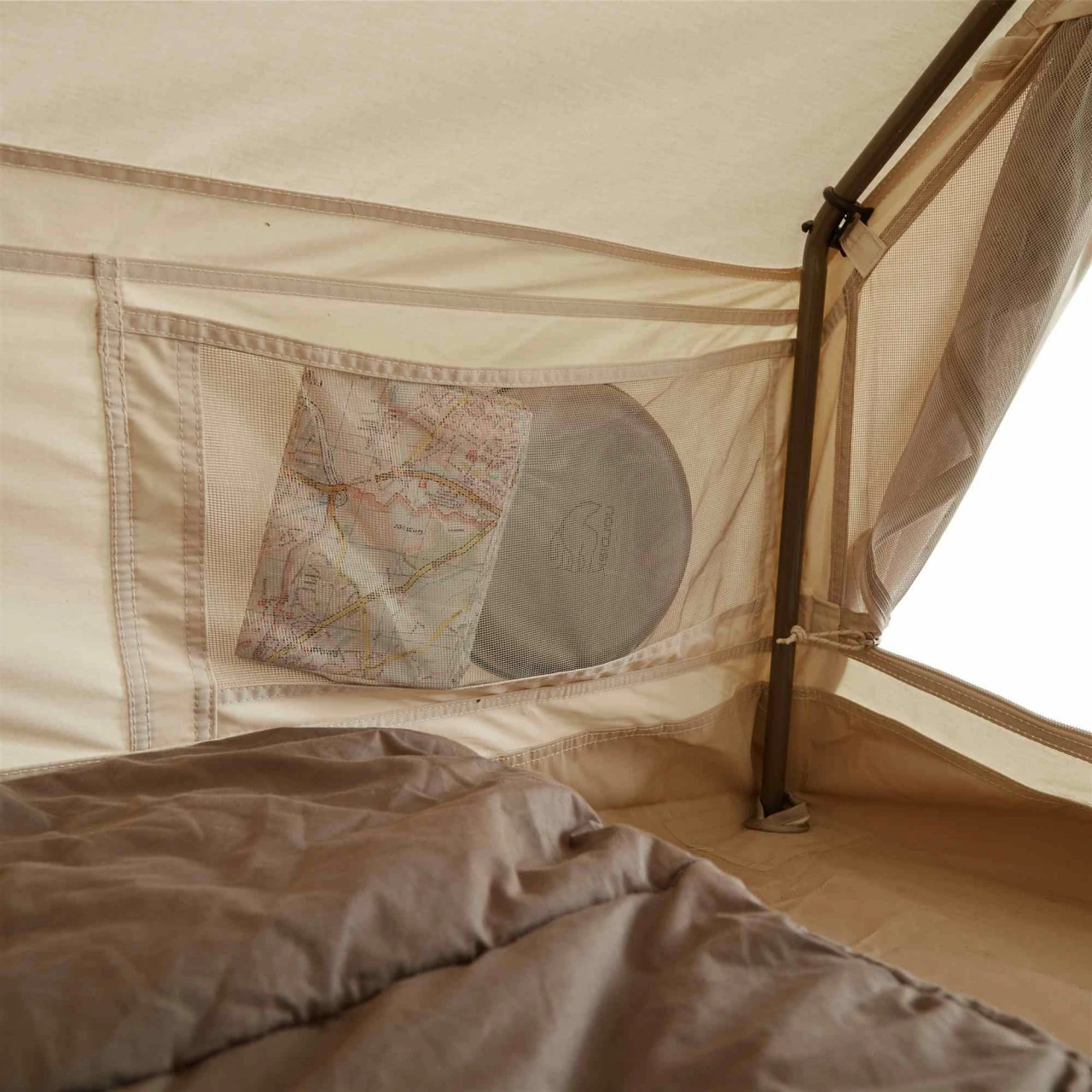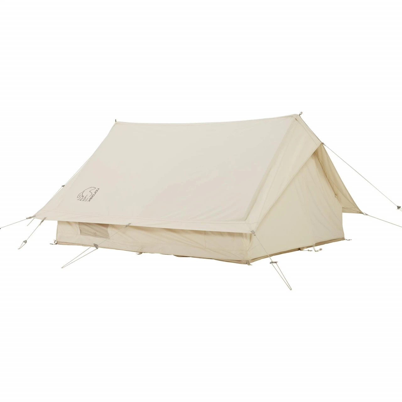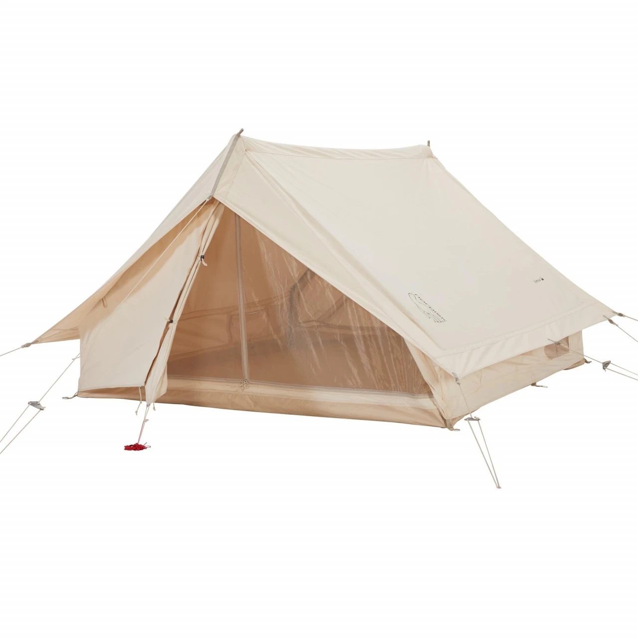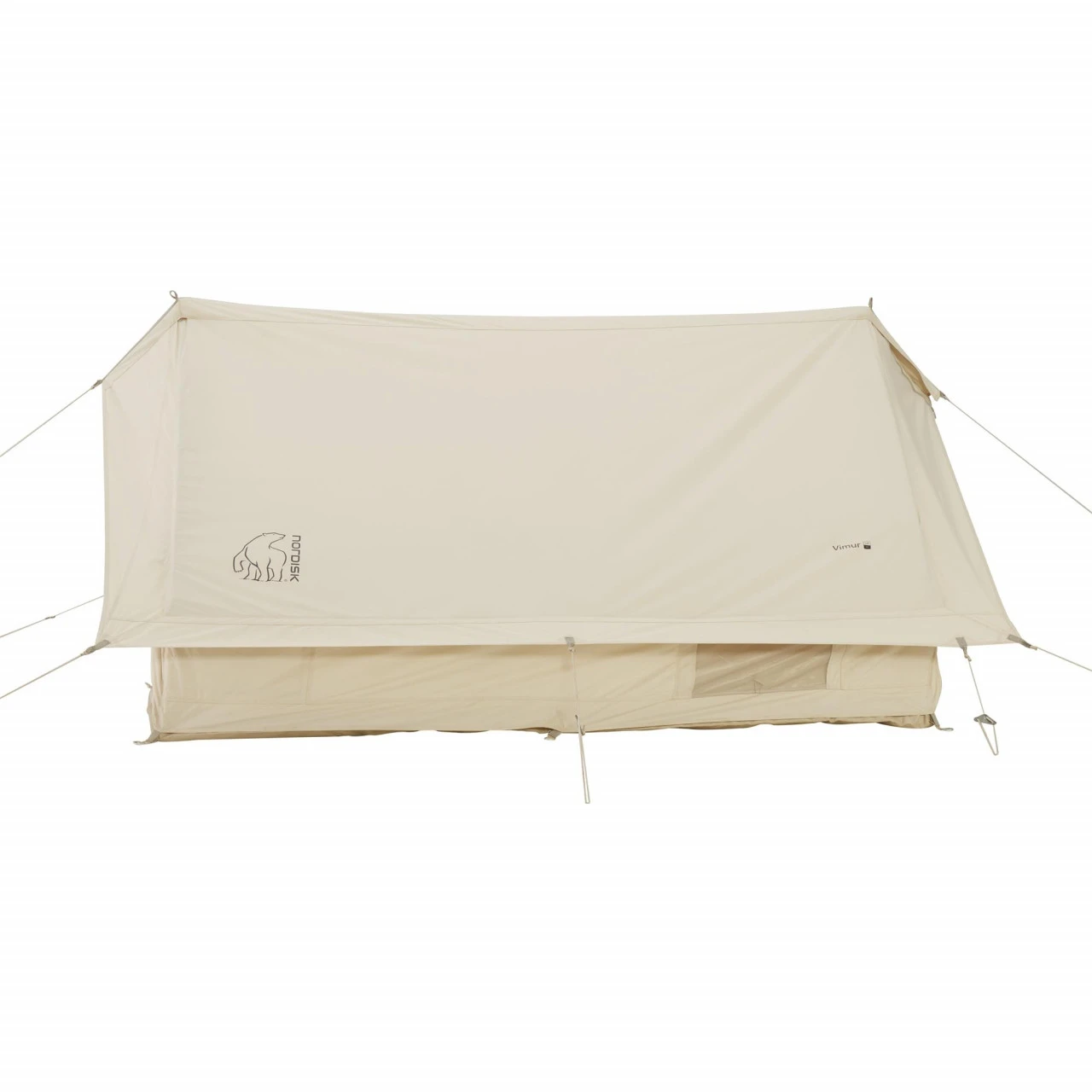 Das Nordisk Vimur 4.8 Familienzelt ist ein 4-Personenzelt, welches einen großen Schlaf-/Wohnbereich hat und sich besonders leicht aufbauen lässt. Es besteht aus einem Baumwoll-Mischgewebe und hat eine hervorragende Belüftung und ein angenehmes Raumklima. In das Innere des Zeltes gelangst Du durch eine der beiden mit Mesh ausgestatteten Türen. Der Mesh-Einsatz dient gleichzeitig als Moskitoschutz und hilft Dir so Insekten aus dem Zelt fernzuhalten. Durch die beiden Türen und zwei Fenster fällt viel Licht in das geräumige Zelt. Außerdem sorgen die Zugänge zum Zelt für eine gute Luftzirkulation im Innenbereich. Darüber hinaus verfügt die Tür über eine versteckte Erweiterung, die entfaltet, zu einer zusätzlichen Apsis wird. Zu den weiteren Ausstattungsmerkmalen des Vimur 4.8 gehören mehrere Taschen im Innenbereich in denen Du deine Wertsachen, Zeitschriften, Smartphone oder Ähnliches verstauen kannst, eine Stehhöhe in der Mitte von 2,70 Metern und eine eingenähte Bodenwanne. Durch die A-förmige Stangenkonstruktion ohne störende Mittelstange entsteht eine „stangenfreie“ Optik. Zusätzlich lässt sich das Vimur 4.8 mit der Midgard-Serie in der Größe und Fläche erweitern.