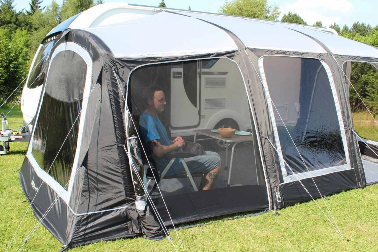 Durch den integrierten Anbau bietet dir das Outdoor Revolution Sportlite Air 320EX Wohnwagenvorzelt zusätzlichen Platz für dein Campingequipment oder für eine Sitzgruppe. Die Frontwände können zur Seite abgerollt werden oder auch zur Hälfte abgeklappt werden, um einen Veranda-Effekt zu erzielen. Für mehr Privatsphäre kannst du die Fenster im Vorzelt mit einem Reißverschluss-Vorhang auch komplett schließen. Das Outdoor Revolution Sportlite Air 320EX Wohnwagenvorzelt besteht aus einem leichten, dennoch sehr robusten und wetterfesten 280HDE Polyester Material. Dieses Material ist besonders von Vorteil, wenn geringes Gewicht im Urlaub eine Voraussetzung ist.