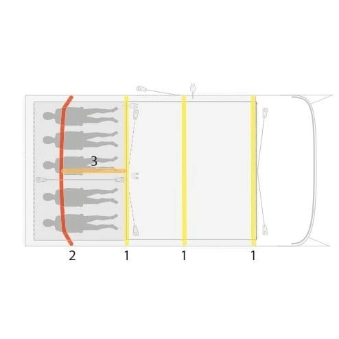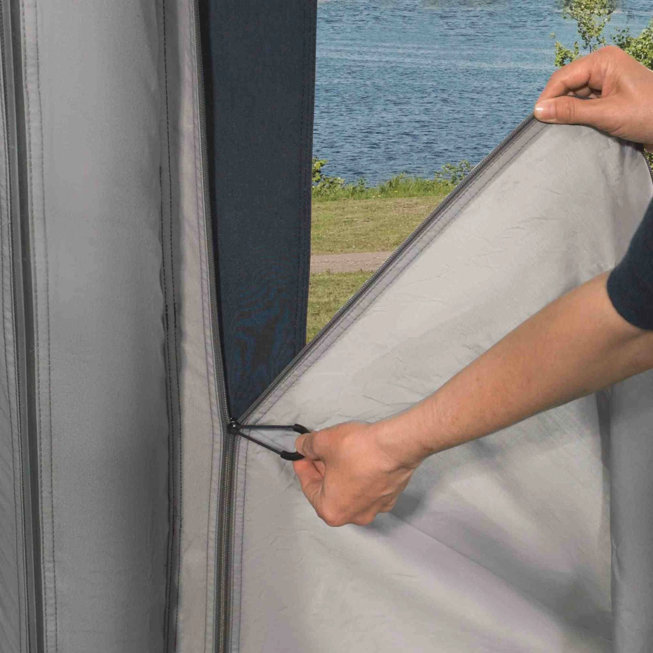 In der 2,30 m langen Ambassador Schlafkabine hast du die volle Stehhöhe des Zeltes. So kannst du bequem auch Feldbetten aufstellen. Das dunkle Material der Kabine erhöht den Schlafkomfort. Die Schlafkabine ist ebenfalls mit einer Quick & Quiet Door ausgestattet.