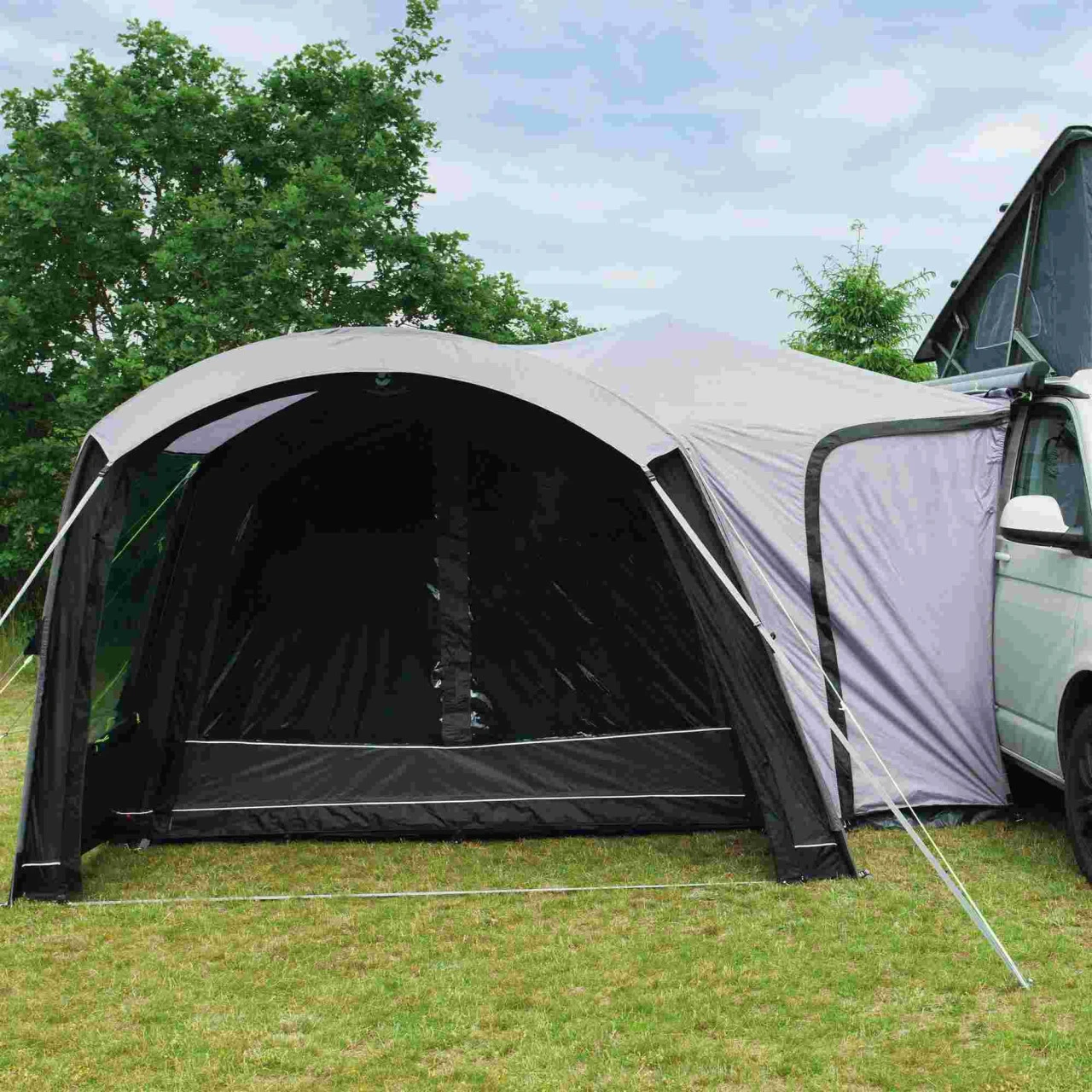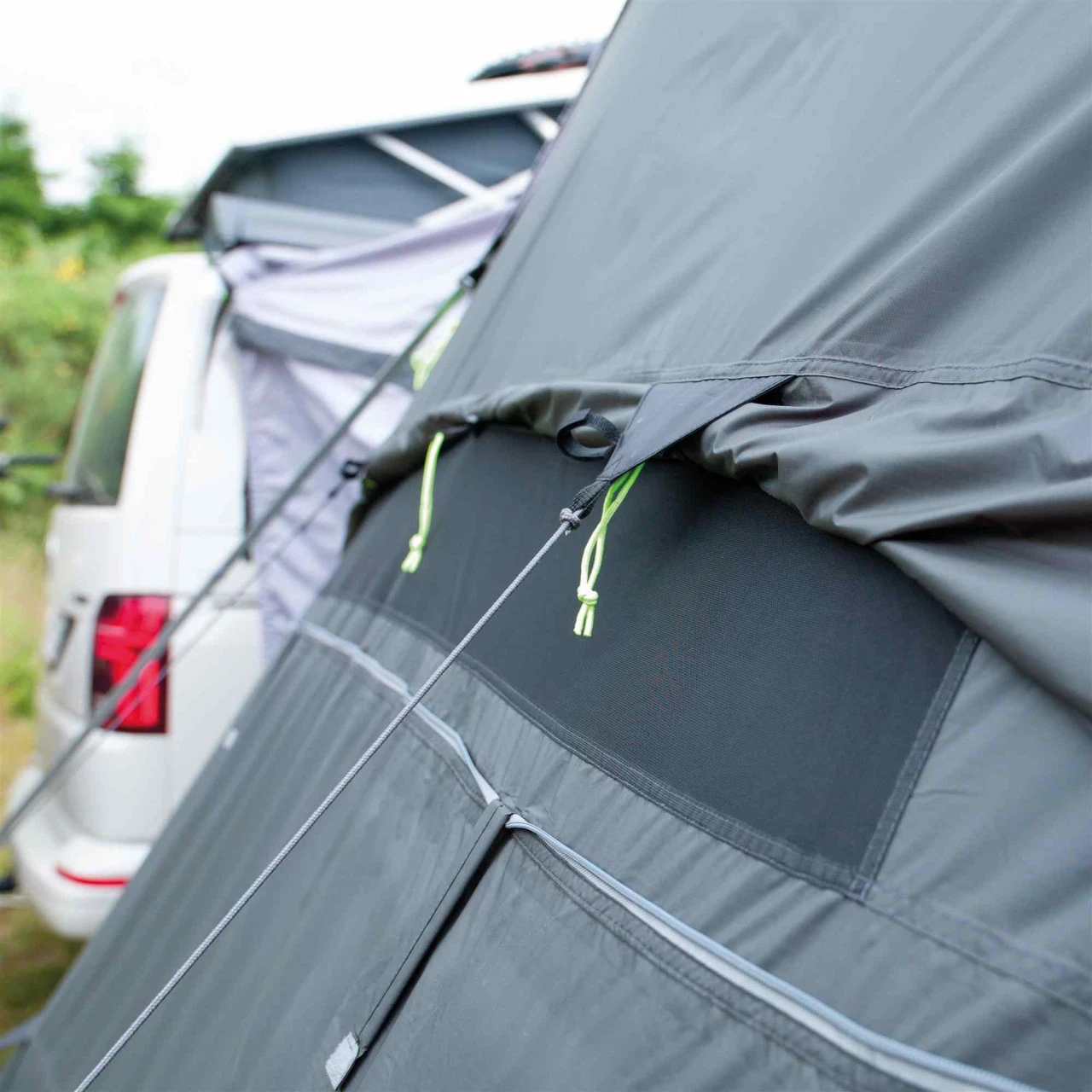 Das Outwell Jonesville 290SA Flex ist das am flexibel einsetzbarste Busvorzelt. Es lässt sich durch das Luftkanalgestänge schnell und einfach aufbauen und kann parallel an beiden Seiten des Fahrzeugs befestigt werden. Das besonders robuste und strapazierfähige Rip-Stop Material sowie die 6000 mm Wassersäule machen das Zelt komplett wasserdicht. Durch die Vier-Schieber-Reißverschlüsse in der Fronttür kannst du entscheiden, ob du die Tür halb oder ganz wegrollst oder ob du den Eingang nur mit einem Moskitonetz schützen möchtest. Wenn du einen größeren, geschützten Wohnraum möchtest, kannst du die große Eingangstür ganz einfach nach vorn versetzen. Durch die Seitentür, die auf der dem Fahrzeug abgewandten Seite liegt, bekommst du noch mehr Flexibilität in der Nutzung des Jonesvill 290SA Flex. Auch diese Seitentüren haben ein Moskitonetz hinter der Wand, was zur besseren Durchlüftung im Zelt dient. Mit der Optional erhältlichen, abgedunkelten Schlafkabine kannst du 2 zusätzliche Schlafplätze im Zelt schaffen. Der Zugluftstopper an der Bodenplane der Schleuse verhindert, dass es bei Wind und Wetter im Zelt zieht. Das HookTrack System ermöglicht es dir, Lampen oder andere Dinge bis zu 1,5 kg Gewicht flexibel im Zelt aufzuhängen und macht es somit noch wohnlicher.
