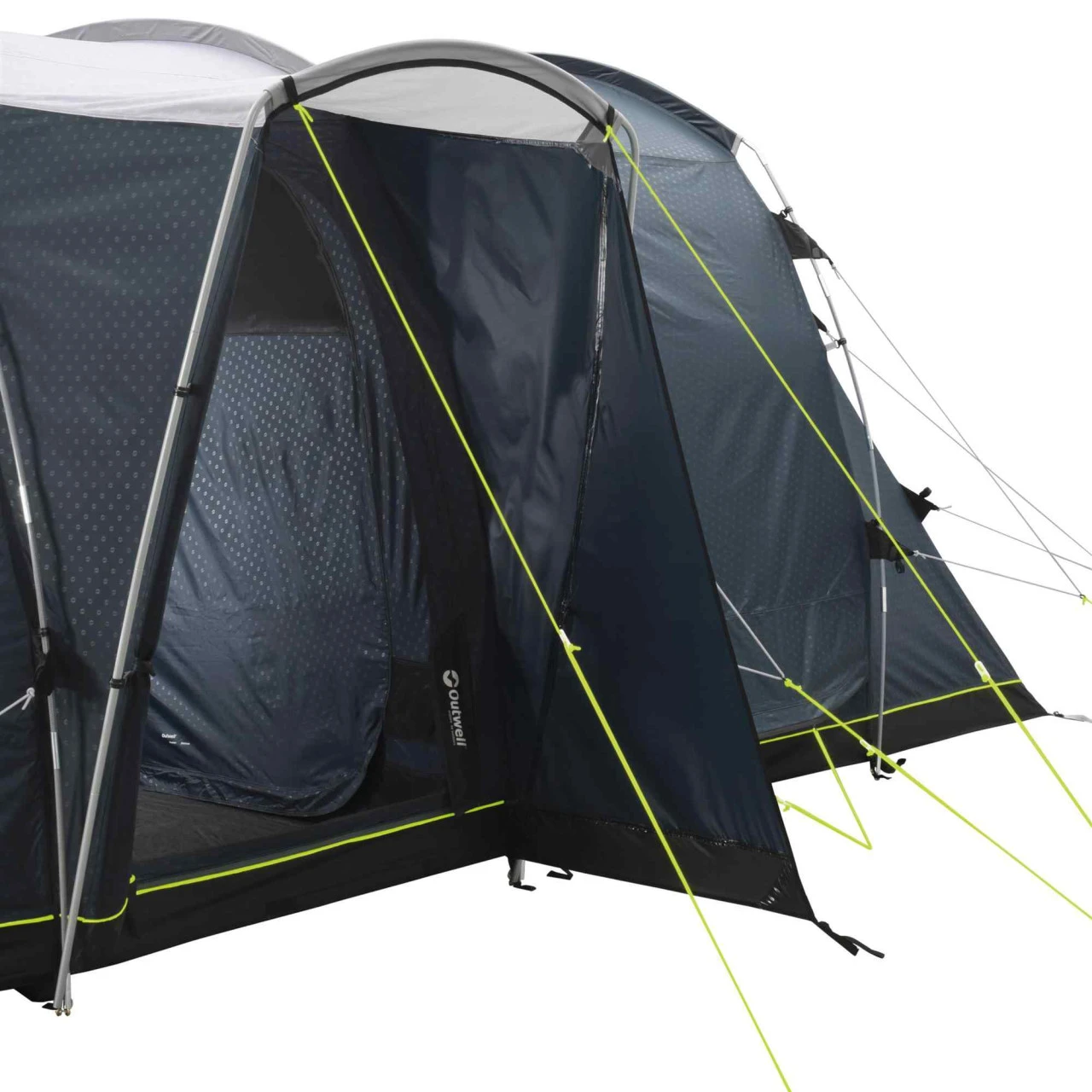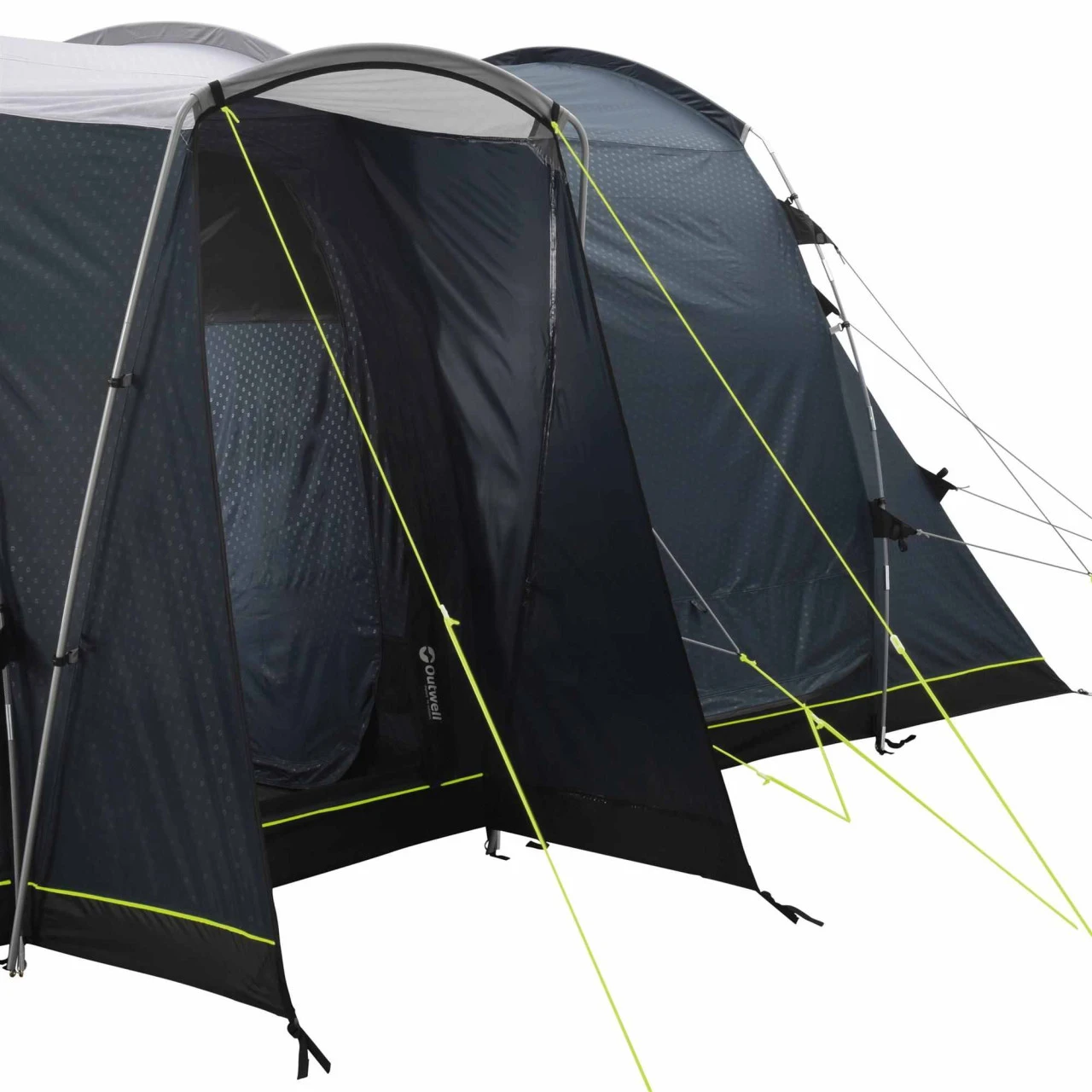 Wenn du nach einem kompakten Familienzelt mit ausreichend Platz suchst, ist das Nevada 5PE Familienzelt von Outwell das ideale Zelt für dich und deine Familie. Das flexible und leichtem Duratec-Gestängesystem sowie das „Easy Pegging System“ aus farblich gekennzeichneten Heringen macht den Aufbau zu einem Kinderspiel. Der Nevada typische überdachte Seiteneingang wurde verbessert und hat zwei wegrollbare Seitenpaneele bekommen, die noch besser vor schlechtem Wetter schützen. Die abgedunkelte Ambassador Master Schlafkabine bietet mit 230 cm Tiefe und der vollen Stehhöhe genügend Platz, um bequem auch Feldbetten aufzustellen. Die Quick & Quiet Tür ermöglicht ein nahezu geräuschloses Verlassen oder Betreten der Schlafkabine, die durch einen Reißverschlussvorhang in zwei Einzelkabinen geteilt werden kann. Der große Fronteingang des Nevada 5 Familienzeltes kann mit Hilfe des doppelten Reißverschlusses komplett geöffnet werden. Er ist aber auch mit einem Moskitonetz ausgestattet, so dass auch nachts gelüftet werden kann, ohne dass Insekten ins Zelt gelangen. Neu ist neben der individuell einstellbaren Belüftung über die komplette Rückseite jetzt auch ein „Low-Ventilation-System“ an der Schlafkabine. Große getönte Fenster mit aufrollbaren Vorhängen verhindern neugierige Blicke ins Zelt.
