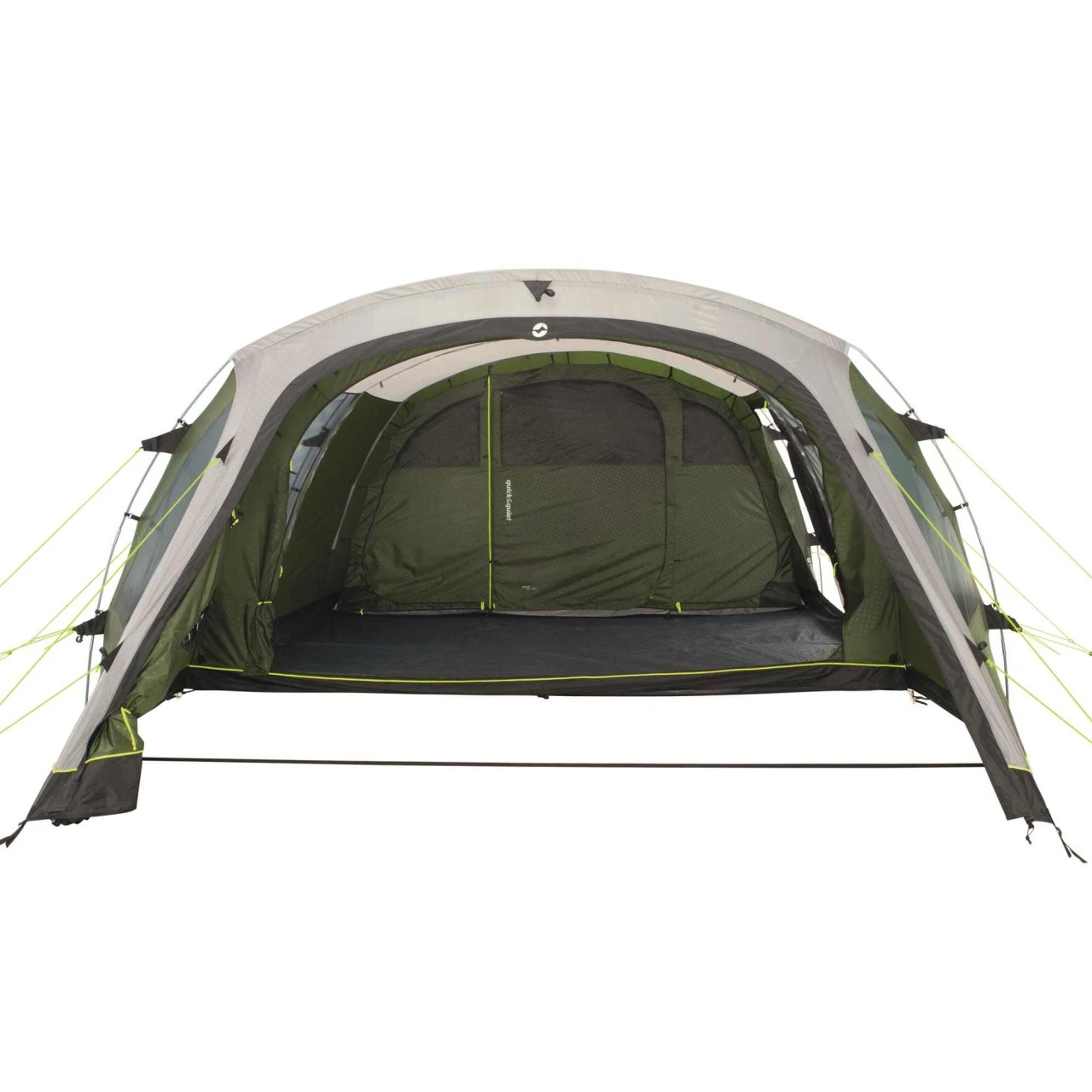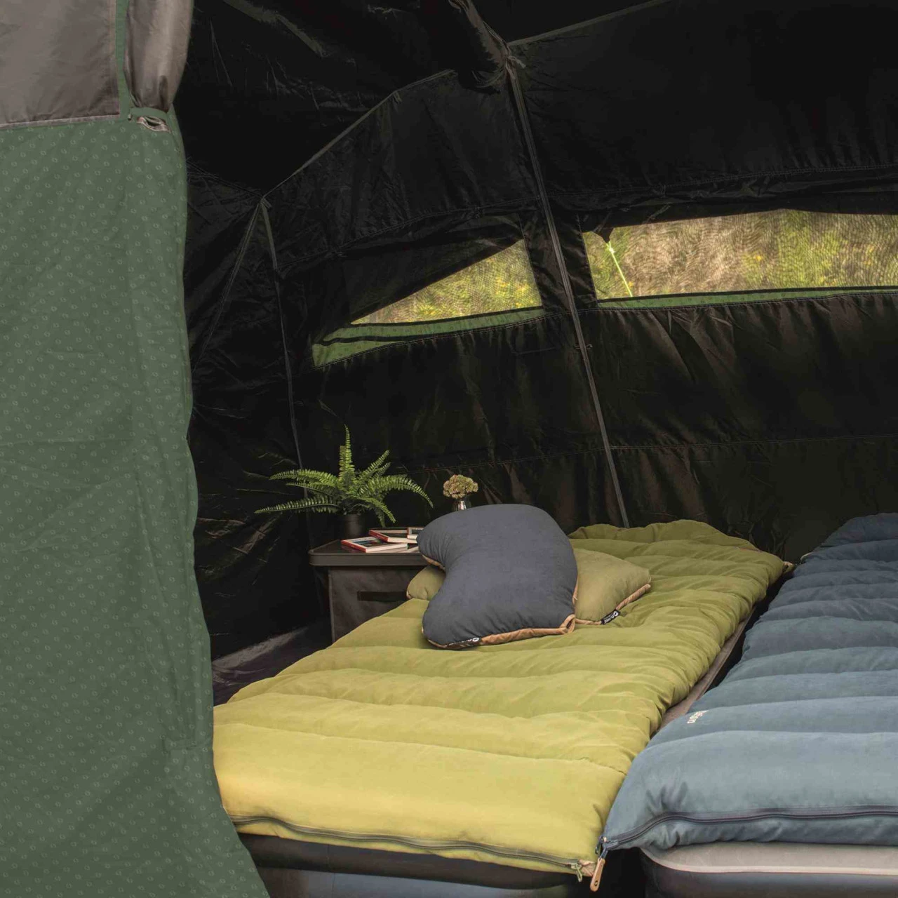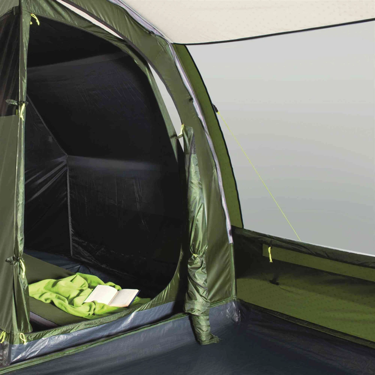 Der Eingang zum Wohnbereich ist mit der patentierten Quick & Quiet Door ausgestattet. Durch den Magnetmechanismus kannst du das Zelt nahezu geräuschlos betreten oder verlassen. Wenn du die Magnetfunktion nicht nutzen willst, kannst du die Tür mit einem doppelten Reißverschluss komplett öffnen. Um dein Winwood 8 komplett zu verschließen, verbindest du die Tür einfach mit der fest eingenähten Bodenplane und schon kommt kein Insekt mehr ins Zelt. An der Seite des Wohnbereichs befindet sich ein zusätzlicher Eingang, der dir noch mehr Flexibilität beim Camping ermöglicht. Das Dach über dem Wohnbereich ist aus einem hellen Material hergestellt und schafft so ein helles, angenehmes Wohnambiente im Zelt. Die großen Fenster an der Seite sind leicht getönt und schützen so vor der direkten Sonneneinstrahlung. Wenn du dich vor neugierigen Blicken der Nachbarn schützen willst, kannst du die Fenster einfach mit Vorhängen verschließen.