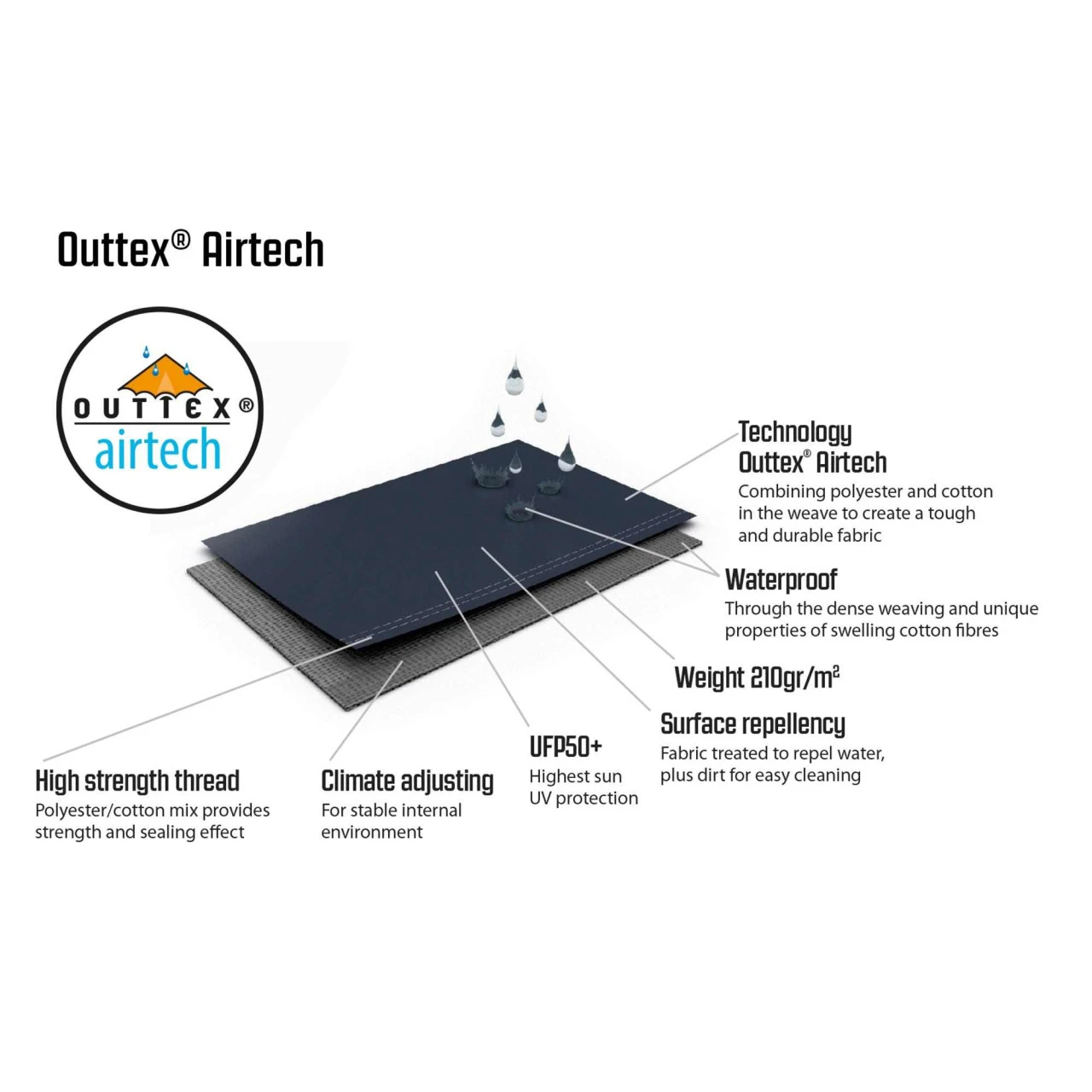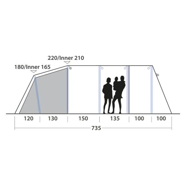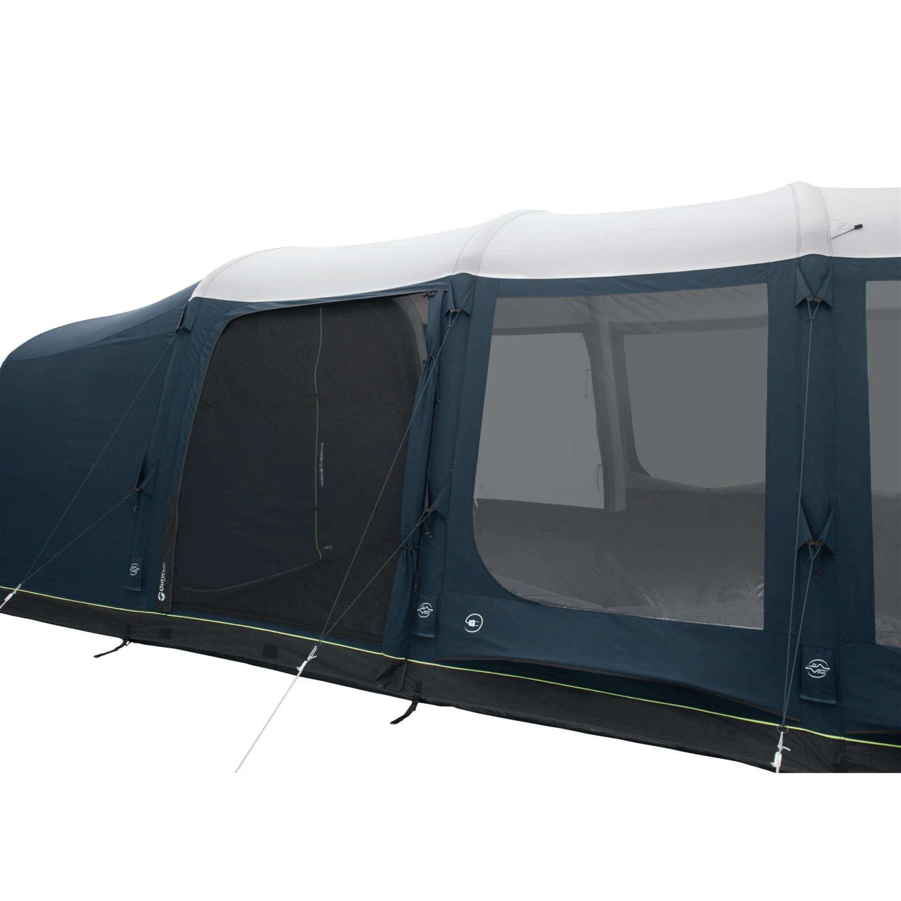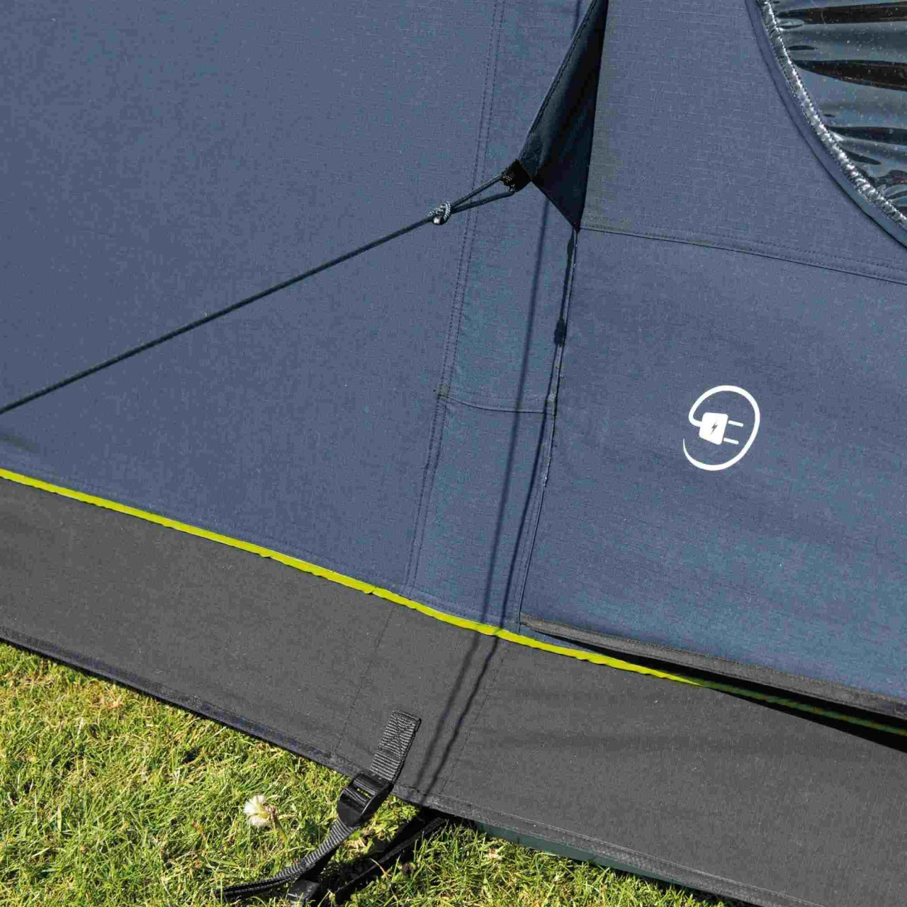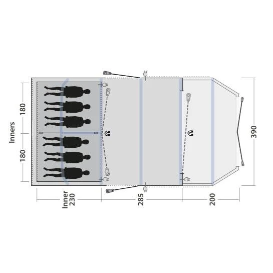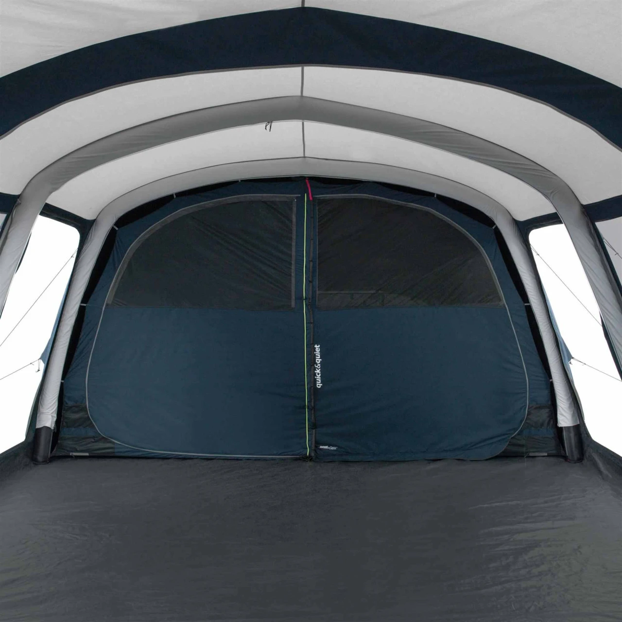 Die große Ambassador Schlafkabine mit einer Tiefe von 230 cm und voller Stehhöhe kann mit Hilfe eines Reißverschlussvorhangs in 2 Einzelkabinen geteilt werden. Das abgedunkelte Material an Wänden und Decke sorgt dafür, dass es im Innenzelt länger dunkel bleibt und ihr so einen erholsameren Schlaf bekommt. Ein manuell anzubringender zusätzlicher Luftschlauch über der Schlafkabine sorgt für zusätzliche Stabilität.