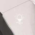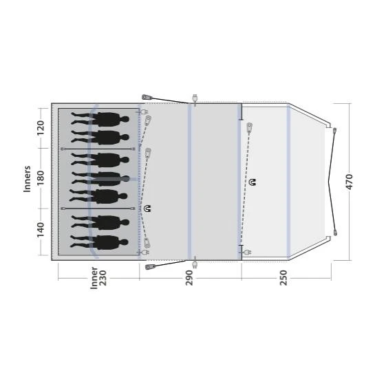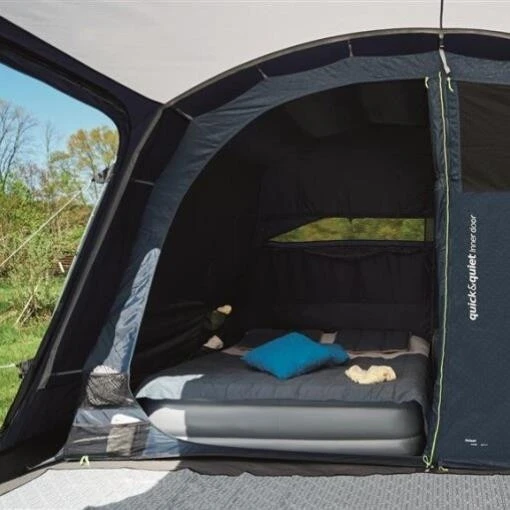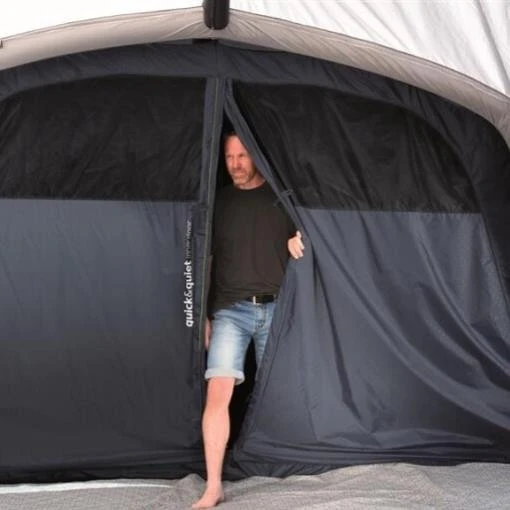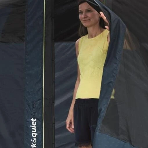 Die große Ambassador Schlafkabine mit einer Tiefe von 230 cm und voller Stehhöhe kann mit Hilfe eines Reißverschlussvorhangs in 2 Einzelkabinen geteilt werden. Das abgedunkelte Material an Wänden und Decke sorgt dafür, dass es im Innenzelt länger dunkel bleibt und ihr so einen erholsameren Schlaf bekommt. Ein manuell anzubringender zusätzlicher Luftschlauch über der Schlafkabine sorgt für zusätzliche Stabilität.