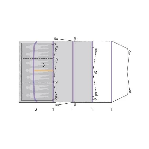 In den Wohnraum gelangst du entweder durch die große, patentierte Quick & Quiet Door mit Magnetverschluss oder durch einen der beiden Seiteneingänge. Die Quick & Quiet Tür kann auf unterschiedliche Arten verwendet werden. Entweder, du nutzt sie mit dem Magneteingang, um dein Zelt geräuschlos betreten oder verlassen zu können, oder du benutzt sie wie einen herkömmlichen Zelteingang. Durch die Reißverschlüsse lässt sich die Tür komplett verschließen. Der eingenähte Boden sorgt zudem dafür, dass keine Insekten ins Zelt gelangen. Mit Hilfe des HookTrack-Systems kannst du z.B. Lampen oder eine Wäscheleine flexibel im Wohnraum deines Zeltes aufhängen.