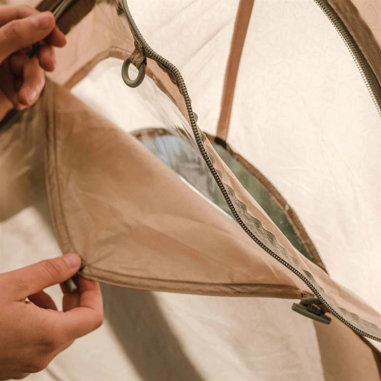 Neben der Belüftung ist im Sommer der Sonnenschutz auch enorm wichtig beim Campen. Beim Wolf Moon XP5 lässt sich ein Seiteneingang mit Hilfe von optional erhältlichen Stangen aufstellen und so zu einem Sonnensegel umwandeln. Der große Haupteingang ist mit einem Vordach sowie Seitenwänden ausgestattet. Dieser Bereich dienst sowohl als Sonnenschutz, aber auch als Schutz, wenn das Wetter einmal nicht so mitspielt.
