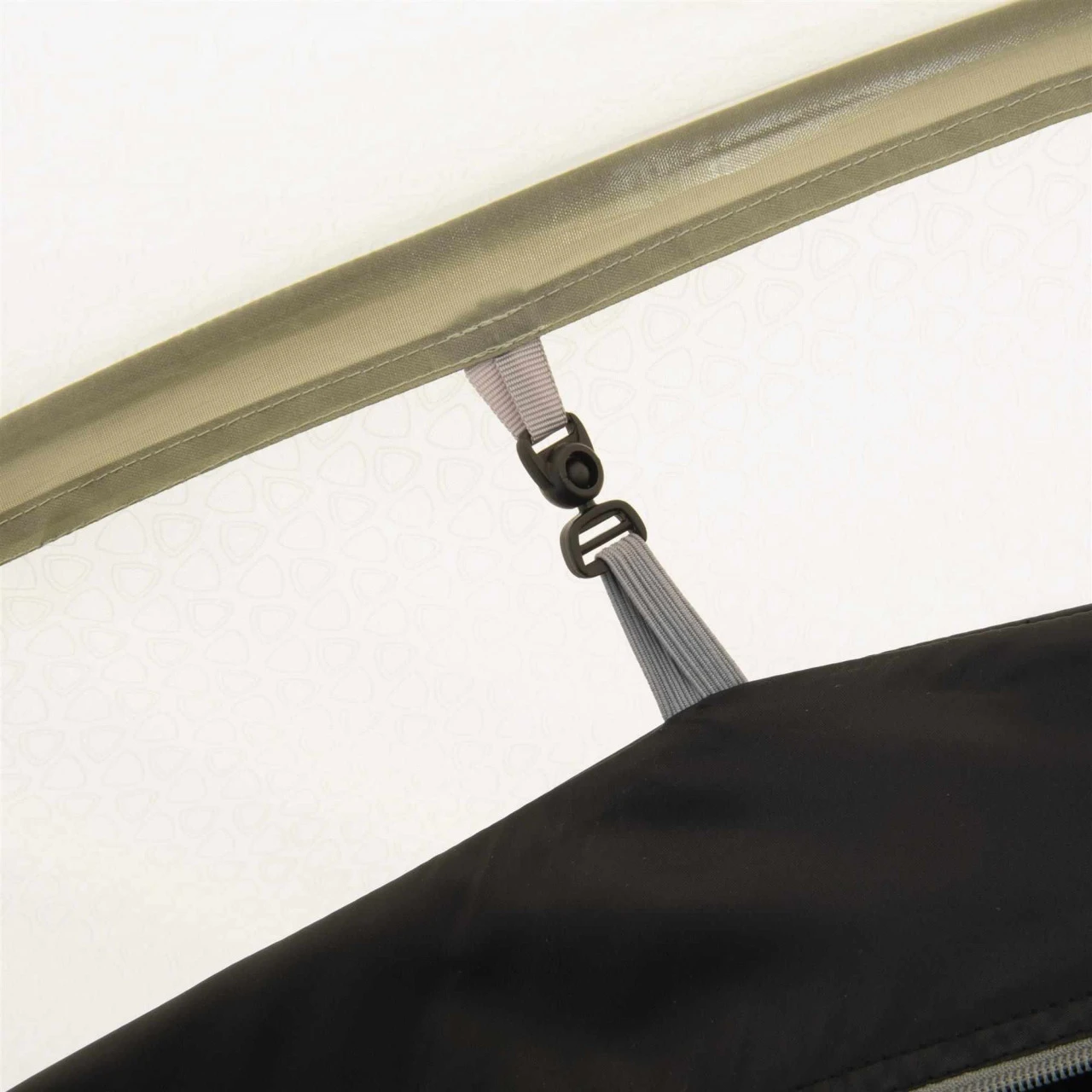 Das Innenzelt ist beim Wolf Moon XP5 von Robens mit Klickschnallen am Außenzelt befestigt. Das hat den Vorteil, dass eine Seite der Kabine bei Bedarf abgeklickt und weggeklappt werden kann. So entsteht zusätzlicher Stauraum im Zelt. Wenn ihr mit der ganzen Familie im Urlaub seid, kann die große Schlafkabine in zwei einzelne Kabinen unterteilt werden, so dass die Kinder getrennt von den Eltern schlafen können. Die Schlafkabine aus atmungsaktivem Polyester ist aus einem abgedunkelten Material, so dass ihr beim Sonnenaufgang länger schlafen könnt. Der Mesh-Himmel lässt die Luft zirkulieren.