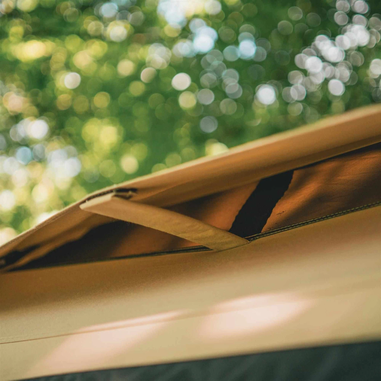 Die große Eingangstür ist mit einem Moskitonetz versehen und kann zum Belüften geöffnet bleiben, ohne das Insekten in die Yurt gelangen. Damit die Luft auch ordentlich zirkulieren kann, gibt es 2 große „Low Vent“ Systeme an den Seiten sowie eine Belüftung über der Eingangstür. Mit diesen Belüftungsöffnungen und dem atmungsaktiven Baumwoll-Mischgewebe steht einem kühlen Urlaub im Sommer nichts mehr im Wege.