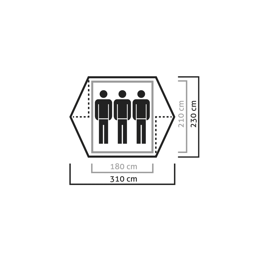 Das Salewa Denali II Kuppelzeit für drei Personen bleibt auch bei Dauerregen dicht. Die seitliche Belüftung sorgt dafür, dass es an warmen Tagen im Inneren nicht stickig wird. Die Apside des Trekkingzelts dient als Stauraum, der Eingang ist regengeschützt.