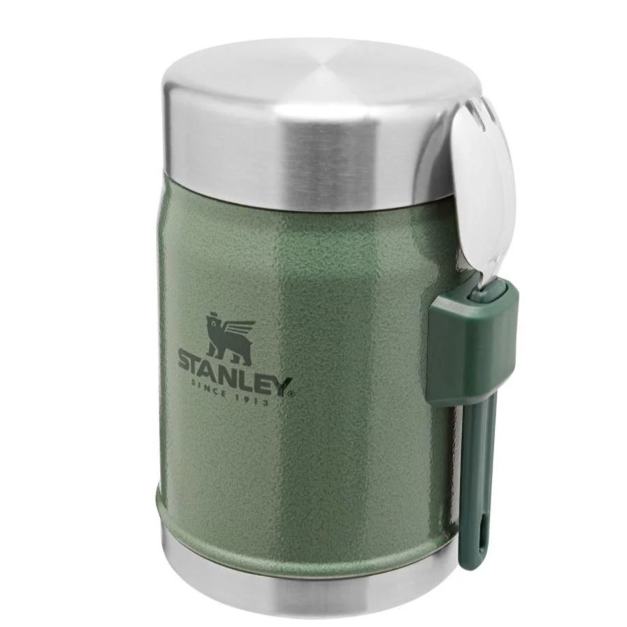 Der Stanley Classic Food Jar + SporkEssbehälter eignet sich perfekt für kleine, heiße Mahlzeiten. Er hat ein Fassungsvermögen von 0,4 Liter. Speisen werden bis zu 7 Stunden warm gehalten. Des Weiteren ist der Classic Food Jar + Spork spühlmaschinenfest, besteht aus rostfreiem Eldestahl und ist BPA-frei. Außerdem bekommst Du zum Essbehälter einen Löffel dazu, der an einer Vorrichtung des Gefäßes seinen Platz findet.