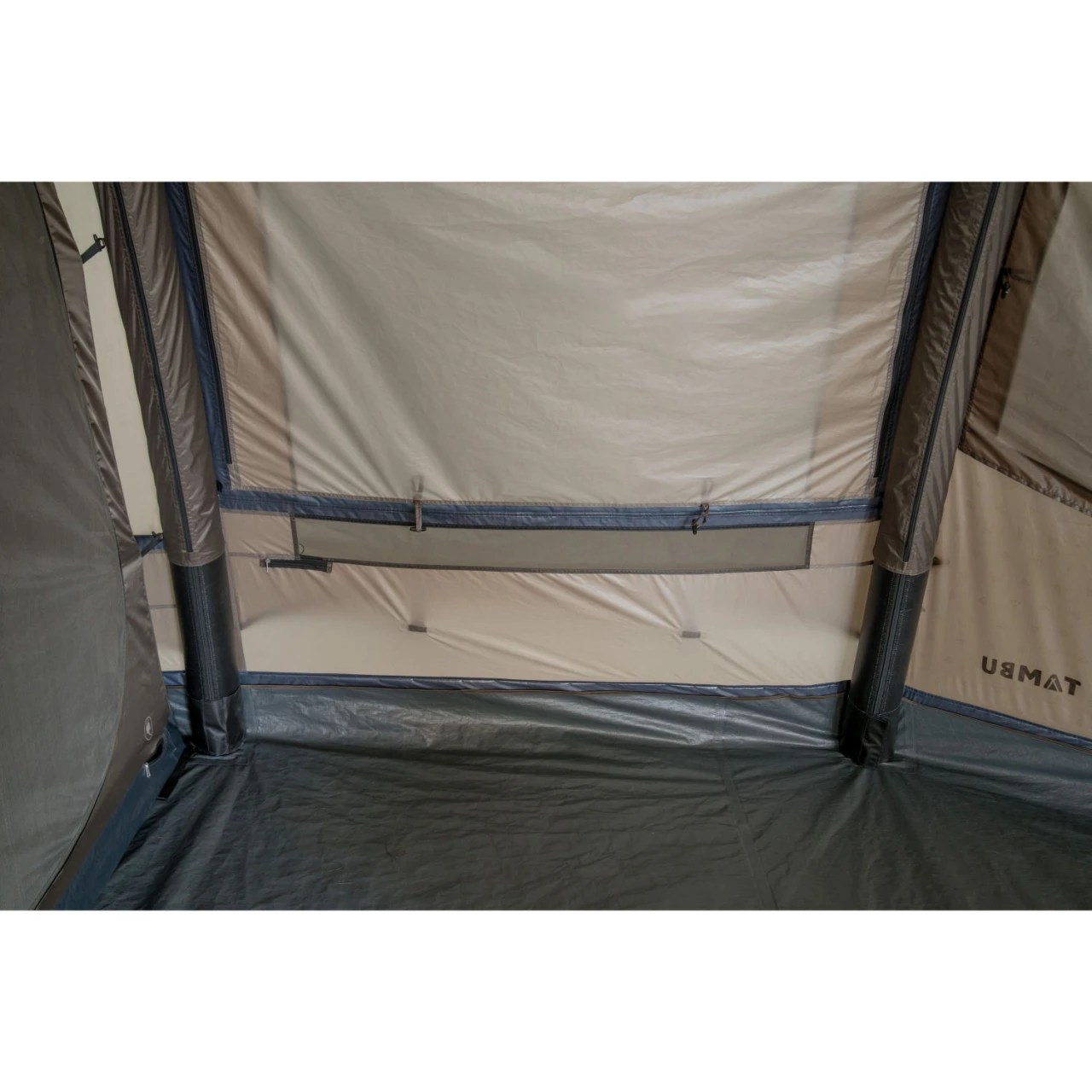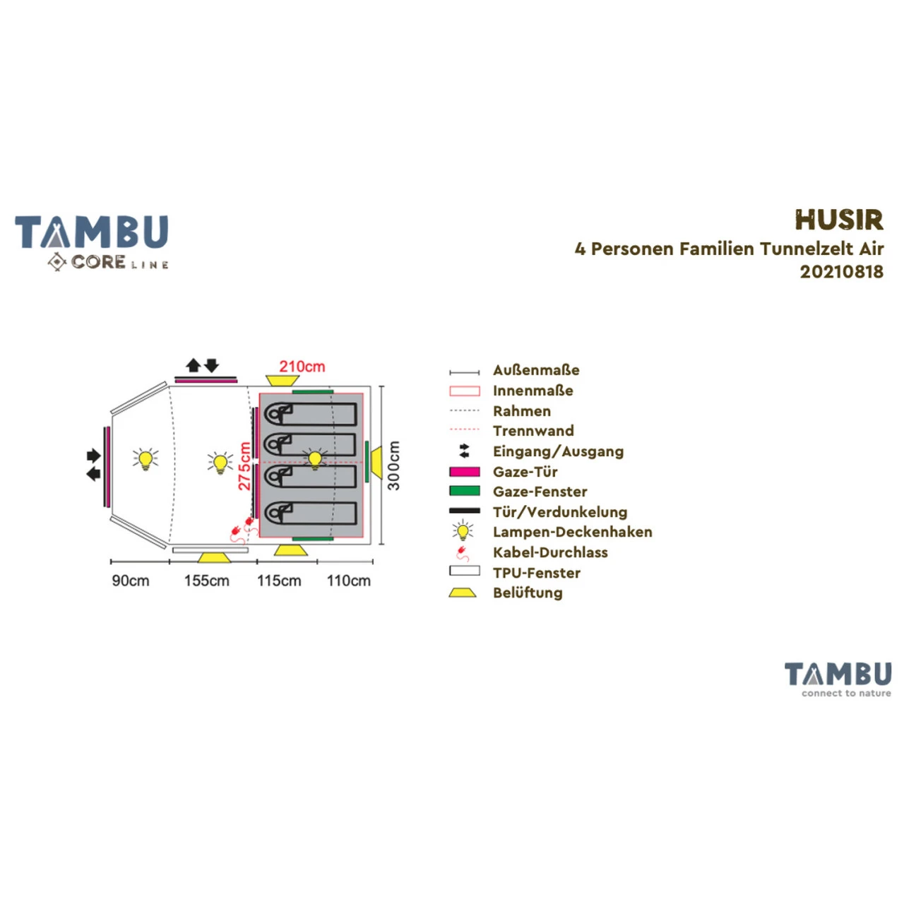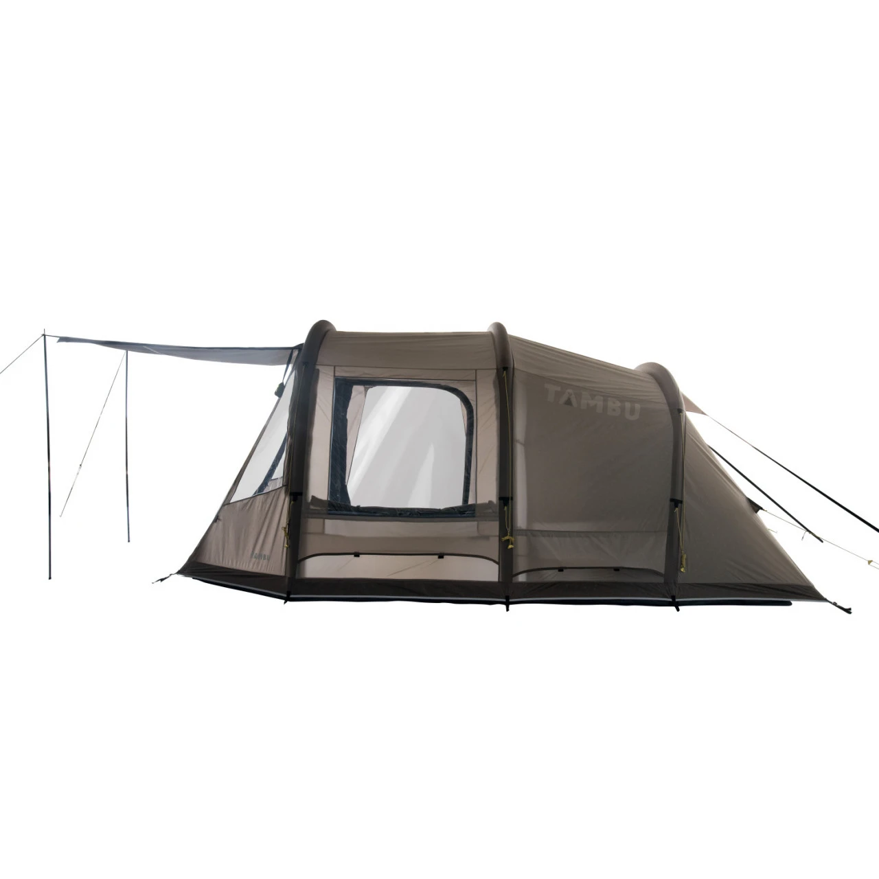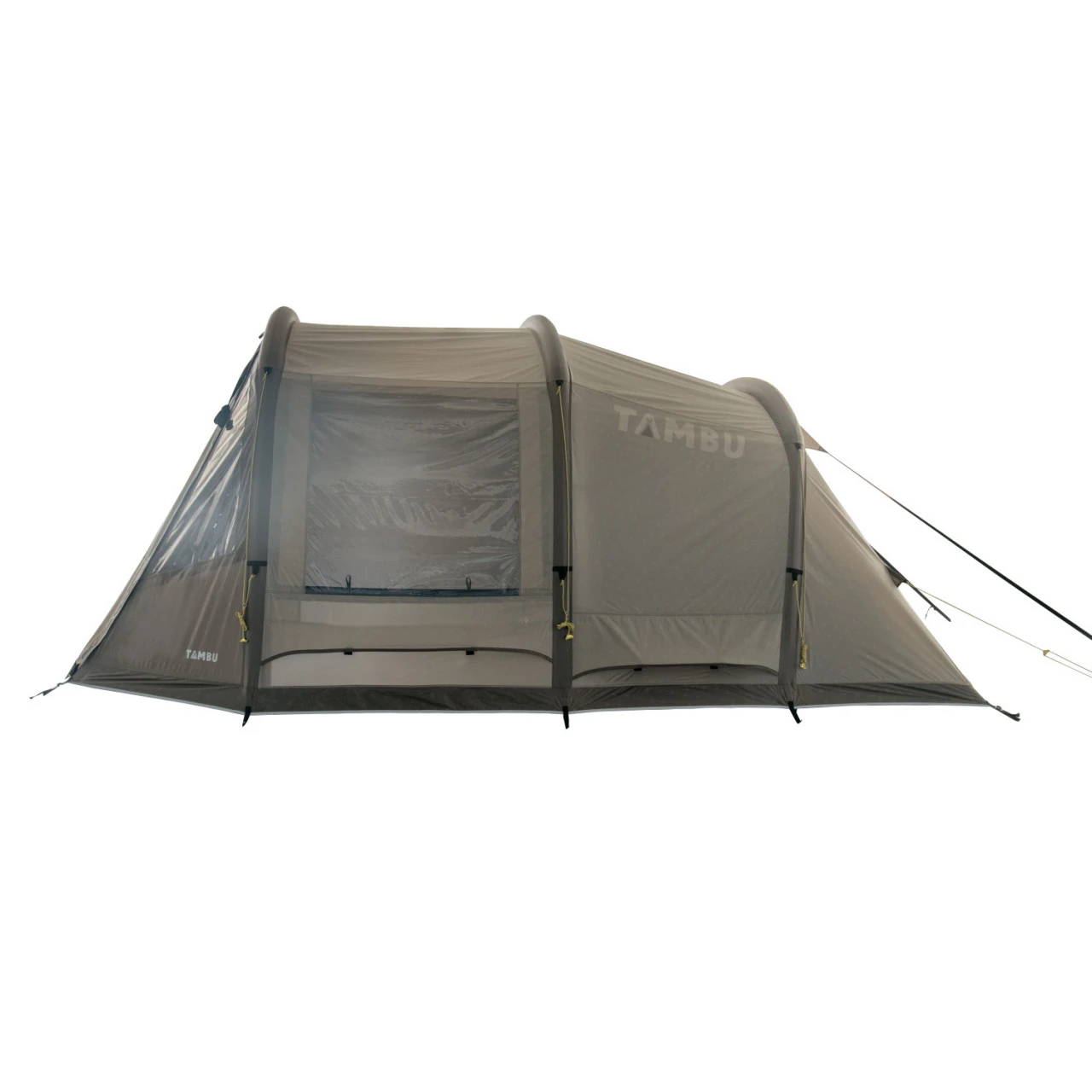 Das aufblasbare Tambu Husir Familienzelt bietet dir komfortabel Platz für 4 Personen. Das Außenzelt sowie die Schlafkabine besteht aus 100% recycletem 75D Polyestergewebe. Die fest eingenähte Bodenplane hält dein Zelt frei von Sand, Wasser und Insekten. Die Schlauchkonstruktion aus TPU sorgt dafür, dass dein Zelt innerhalb weniger Minuten steht. Der überdachte, seitliche Eingang des Husir Familienzelt ermöglicht dir eine Belüftung auch bei widrigen Wetterbedingungen. Beide Türen sind mit zusätzlichen Moskitonetztüren ausgestattet. Mit den mitgelieferten Aufstellstangen kannst du den Fronteingang aufstellen, um so über einen schattiges Plätzchen zu verfügen.