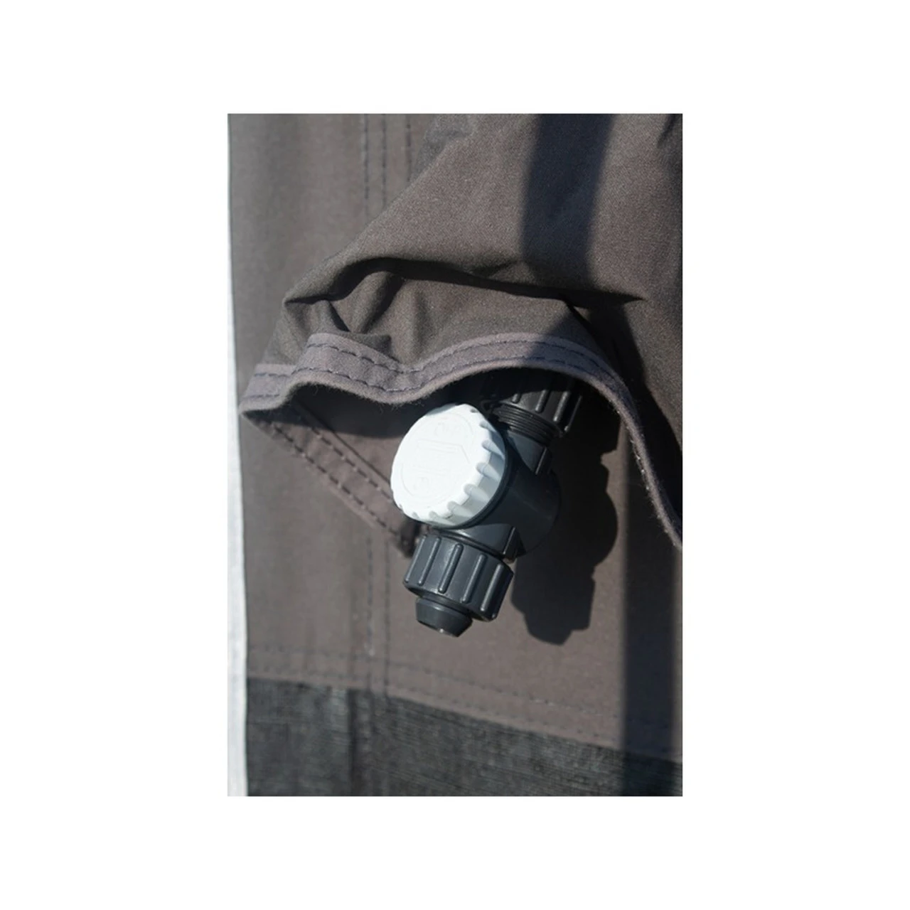 Das Telta Pure 390 Wohnwagen- und Wohnmobilvorzelt bieten dir maximale Flexibilität und ein offenes Raumgefühl dank des vielseitig einsetzbaren Frontelements. Ob hochgerollt als Sonnensegel oder vollständig herausnehmbar für den Tag und heruntergrollt für die Nacht – das Telta Pure 390 Wohnwagen- und Wohnmobilvorzelt lässt sich im Handumdrehen jeder Situation von dir anpassen. Mit einer nahezu senkrecht stehenden Frontwand und viel Kopffreiheit bietet es ein angenehmes Raumgefühl. Dank des robusten Luftschlauchsystems ist das Telta Pure 390 im Handumdrehen aufgebaut und bringt dir Stabilität bei allen Wetterlagen. Mit einer Tiefe von 2,50m ist das Vorzelt kompakt und passt auch auf kleine Stellplätze. Die großen Fenster an der Front maximieren den Lichteinfall und können mittels der Reißverschlüsse in alle Positionen gebracht werden.