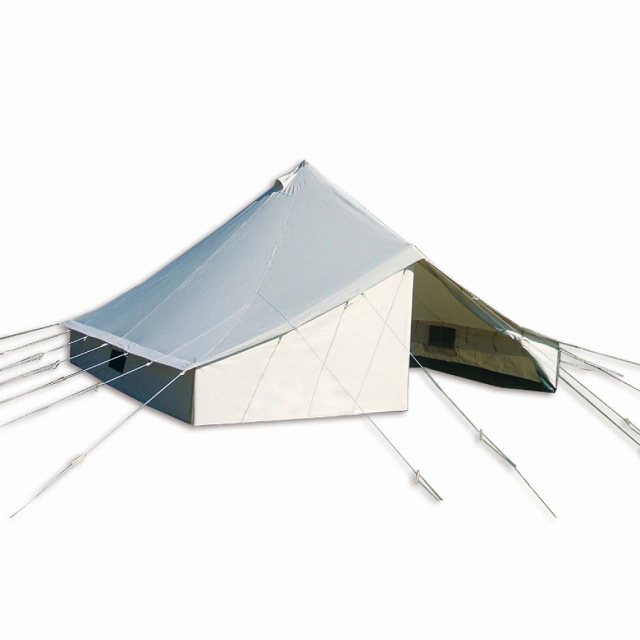 Das Tortuga Yellowstone Gruppenzelt ist eine gelungene Alternative zu Rundzelten. Acht bis zwölf Personen haben in dem Gruppenzelt reichlich Platz. Die Mittelhöhe von 250 cm bietet ein großzügiges Raumgefühl und die rechteckige Konstruktion nutzt die Grundfläche optimal aus. Das Stahlgestänge garantiert mit dem Holzmittelmast die Stabilität des Gruppenzeltes. Das atmungsaktive Baumwollgewebe sorgt mit den beiden Ventilationsöffnungen in der Zeltspitze und den kleinen Mesh-Fenstern in den 60 cm hohen Seitenwänden für ein angenehmes Zeltklima. Praktisch ist auch, dass die Zeltwand an der Eingangsseite komplett aufgerollt werden kann, sodass Ihr eine freie Sicht nach außen genießen könnt. Das Tortuga Yellowstone Gruppenzelt eignet sich deshalb ideal, um die Natur zu genießen.