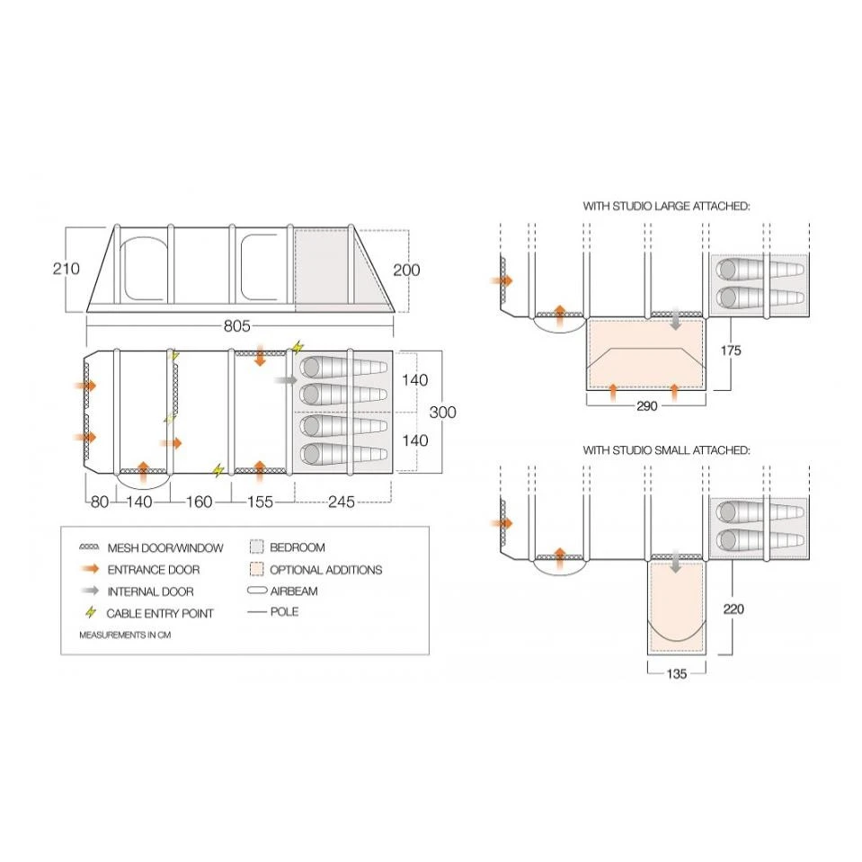 In das abgedunkelte Innenzelt mit extra viel Schlafplatz (70 cm pro Person) kommst du durch eine noch breitere Öffnung ohne Schwelle. Wenn es nötig ist, kann die Schlafkabine durch einen Vorhang geteilt werden. Das Vango Anantara IV Air TC 450XL verfügt über eine optimale Belüftung. Die Türen verfügen über einen 2-Wege-Reißverschluss, so dass die obere Hälfte der Türen zur besseren Belüftung geöffnet werden können. Wenn du dein Vango Anantara IV Air TC 450XL erweitern willst, stehen dir optionale Seitenerweiterungsmöglichkeiten zur Verfügung.