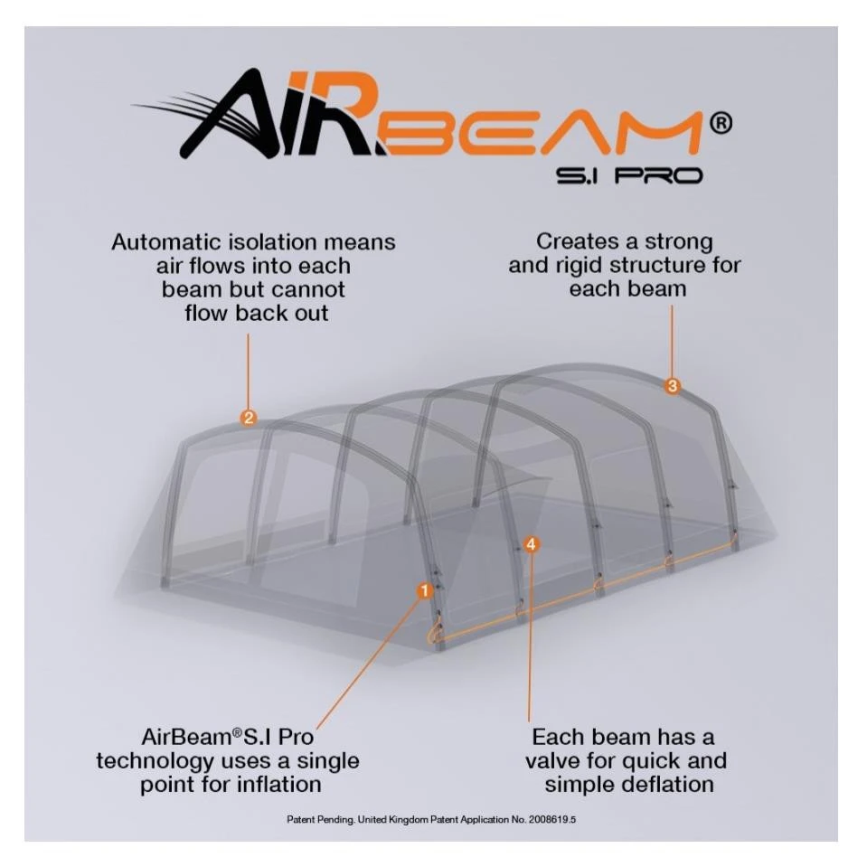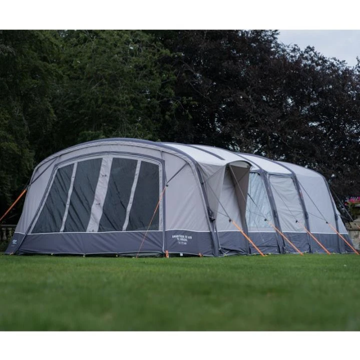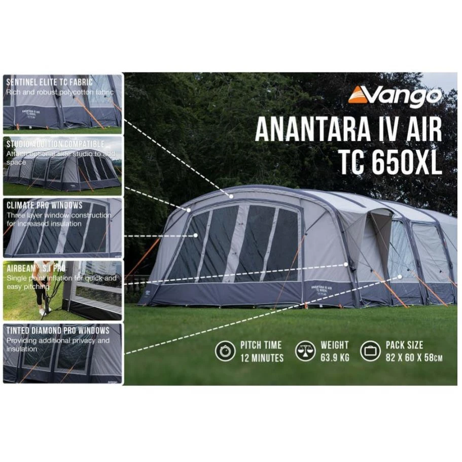 Das aufblasbare Vango Anantara IV Air TC 650XList ein großes Familienzelt mit einem Baumwoll-Mischgewebe und der revolutionären AirBeam® S.I Pro-Technologie von Vango, die das Aufstellen noch einfacher macht. Du musst das Zelt nur ausgebreitet hinlegen, an den Eckpunkten fixieren und mit der mitgelieferten Doppel-Hub-Pumpe aufpumpen. Das Sentinel Elite Gewebe ist eines der stärksten und haltbarsten Gewebe in der Vango Kollektion. in der TC-Version ist es eine Mischung aus 65% Polyester und 35% Baumwolle. Die Wassersäule liegt bei 5.000 mm. Die Eingangstür ist mit „Climate Pro Windows“ ausgestattet. Hierbei handelt es sich um „3-lagige Fenster“: komplett offen schützen sie durch ihr durchgehendes Mesh vor Insekten, bieten aber eine optimale Belüftung. Wenn das Wetter schlechter wird, schliest du die Tür einfach mit einem PVC-Fenster. Wenn du am Abend deine Privatsphäre genießen willst, machst du zusätzlich noch den Vorhang zu und schon kann kein Nachbar mehr ins Zelt schauen. Über die gesamte Fläche des Vango Anantara IV Air TC 650XL ist eine robuste, strapazierfähige und wasserdichte PE-Bodenplane eingenäht. Es gibt mehrere Kabeleinführungsmöglichkeiten und am Eingang ist eine Kabelführung so angebracht, dass du ein Kabel ordentlich in den Markisenbereich an der Vorderseite des Zeltes führen kannst.