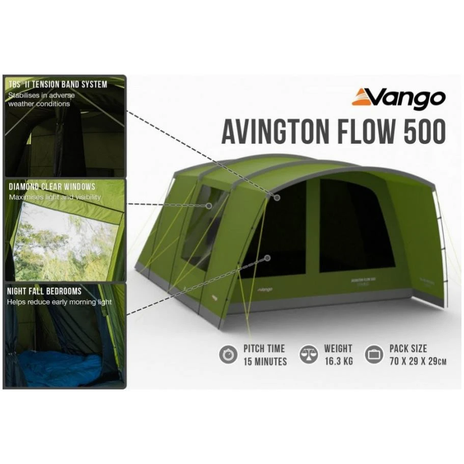 Für die neue Saison ist das Vango Avington Flow 500 das ideale Familienzelt für den Sommerurlaub. Bei diesem Zelt wurde besonders viel Wert auf die Belüftung gelegt. Das Avington Flow 500 Familienzelt verfügt über eine komplett wegrollbare Vordertür mit 2 großen Netzpaneelen. An der Zeltrückseite befindet sich eine große, individuell einstellbare Belüftung. Der große, überdachte Eingangsbereich dich und deine Familie zusätzlich vor Regen und Wind, aber auch vor Sonne. Das Sentinel-Experience-70D Polyester Gewebe sorgt in der gewohnten Vango Qualität für ein geringes Gewicht und Packmaß. Der komplett eingenähte PE-Zeltboden ist komplett wasserdicht, hält das Zelt sauber und die Insekten draußen. Damit kleine Kinder nicht stolpern, kannst du an den Eingängen den Boden nach unten klappen.