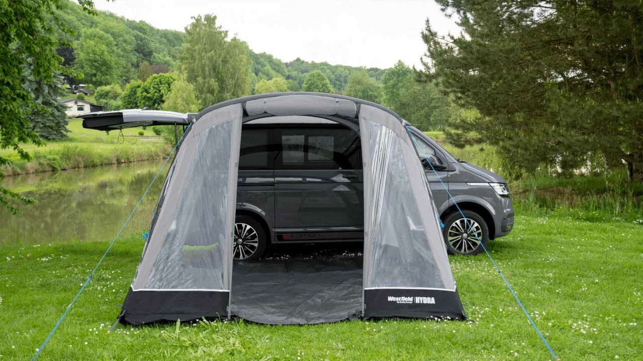 Das Westfield Hydra Luftvorzelt für Busse bietet dir eine optimale Flächennutzung. Du kannst es als freistehendes Vorzelt nutzen, aber auch mit der optionalen Schleuse an deinen Bus anbinden. Durch die angebrachten Lüftungsklappen unter den Fenstern, kannst du das Westfield Hydra Luftvorzelt perfekt belüften. Dank des Air-Erect-Systems werden die zwei Luftkammern schnell aufgepumpt und ermöglichen dir einen schnellen Auf- und Abbau und die Freiheit einfach weiterzuziehen.