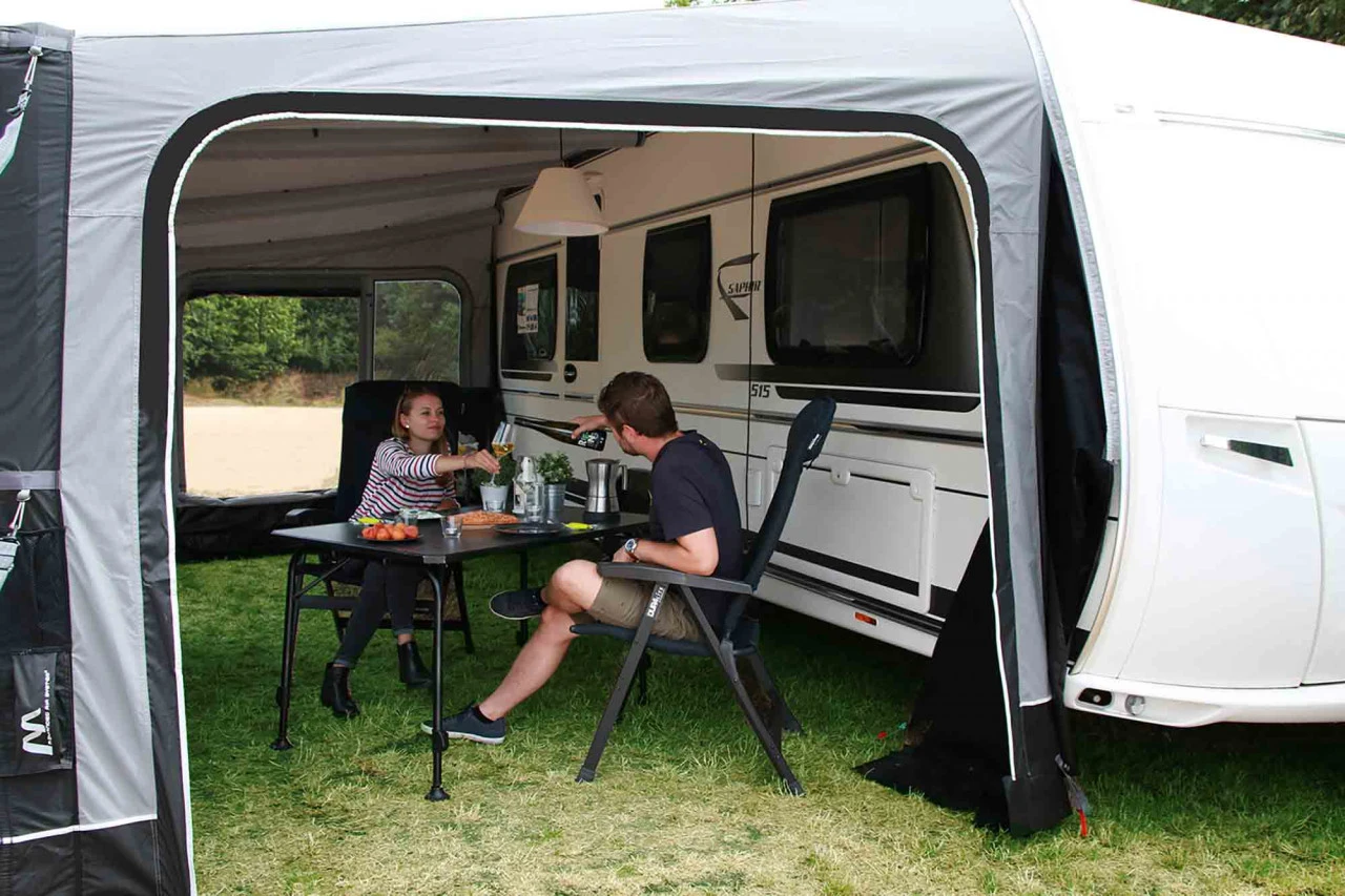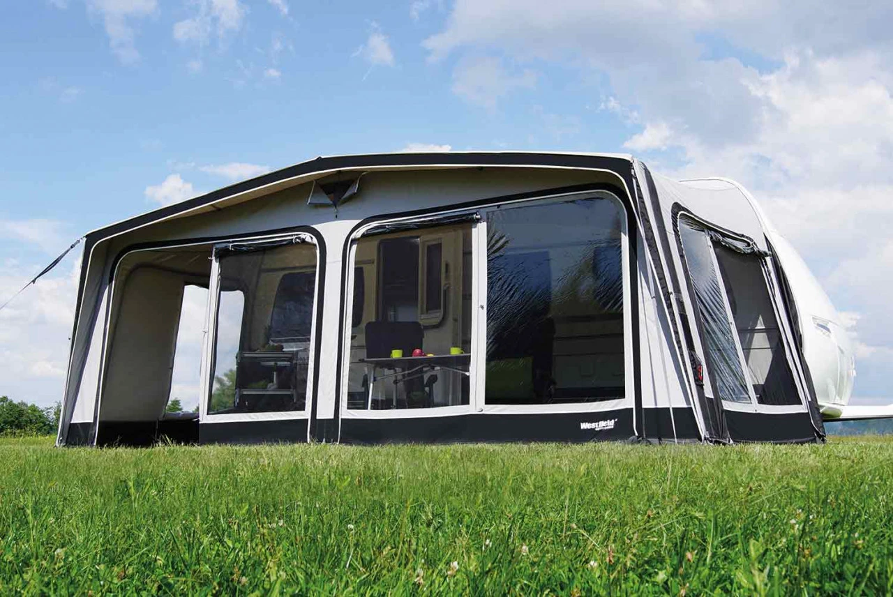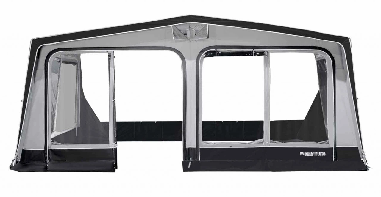 Das Westfield Pluto Wohnwagenvorzelt ist dein idealer Begleiter für deine nächste Reise, da es durch die AAS-Lufttechnik nur an einem Punkt aufgepumpt wird und das in wenigen Minuten. Es besteht außerdem aus dem reißfesten und strapazierfähigen HydroTech® CottonTouch-Material, welches speziell für Caravan und Reisemobile entwickelt wurde. Dieses Polyestergewebe ist besonders UV-beständig. Des Weiteren verleiht diese Beschichtung dem Zelt einen fühlbaren Baumwoll-Charakter. Durch den Volleinzug wird es ganz einfach in die Kederschiene eingezogen. Somit ist dir eine perfekte Abdichtung an den Seiten deines Caravans garantiert. Das Pluto Wohnwagenvorzelt besticht vor allem durch sein großzügiges Platzangebot im Inneren. Zwei Seitenwände sind mit einer getönten Fensterfolie ausgestattet, die zusätzlich auch über ein Moskitonetz verfügen und somit Insekten fernhalten. Die beiden Wände der Frontseite sind mit getönten Panoramafenstern, einer Tür und einem Moskitonetz versehen. An warmen Tagen besteht die Möglichkeit die Seitenwände des Zeltes zu entfernen und wie unter einem Pavillon im Grünen zu sitzen und die Natur zu genießen. Für ein gutes Zeltklima sorgt die dauerhafte Hochentlüftung, sodass in deinem Zelt ein angenehmes Klima herrscht. Ein optionales Vordach an der Front des Zeltes, das du mittels Keder anbringst, verschafft dir zusätzlich geschützten Raum – ob bei Sonne oder Regen.