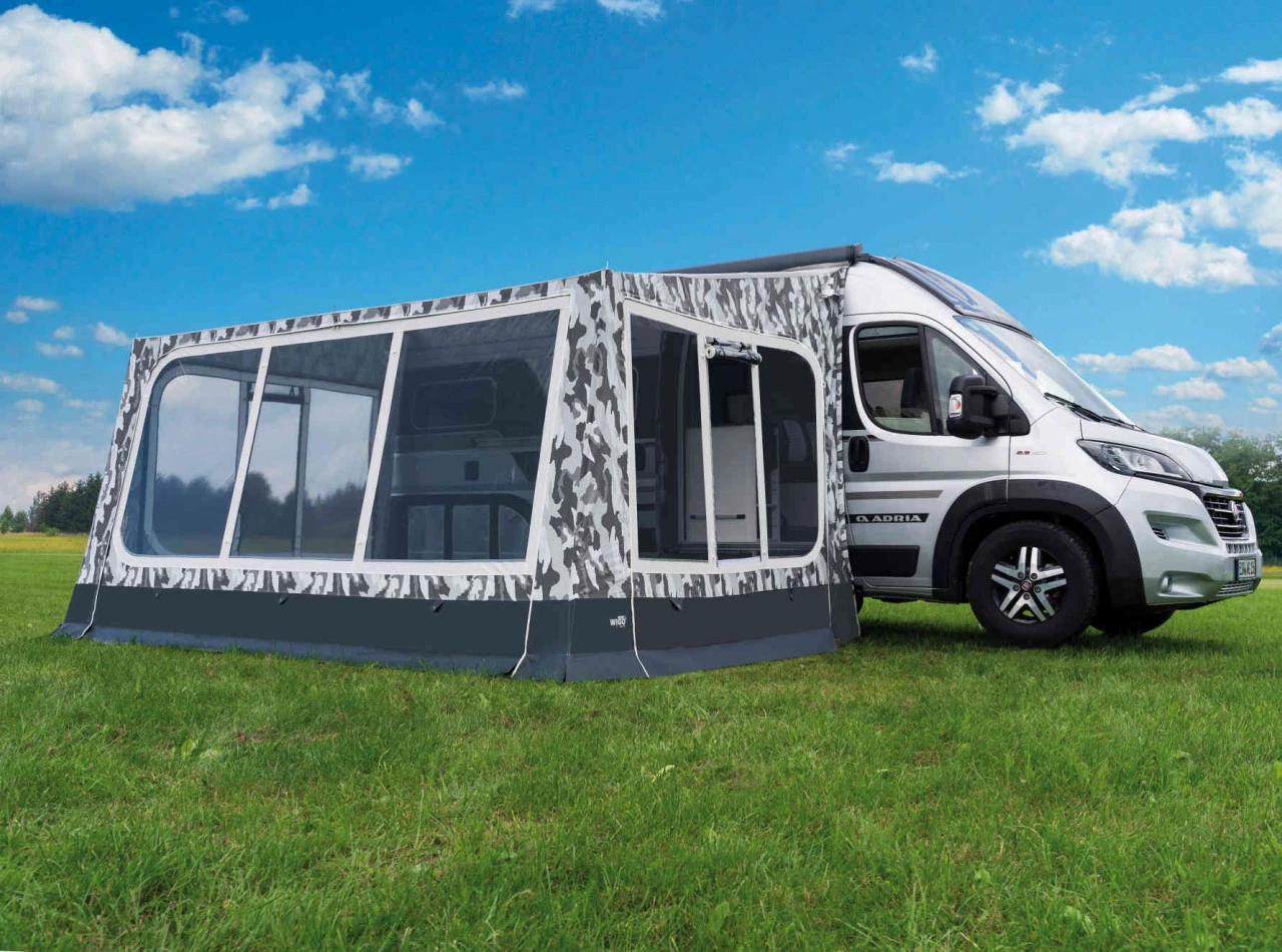 Mit auffallend guter Tarnung! Falls du an deiner Lieblings-Strandfront modische Akzente setzen möchtest oder dich nahtlos in die umliegenden Wälder einfügen willst, bist du mit dem extravagantem Wigo Camou XL Kastenwagenvorzelt bestens ausgerüstet. Dank des TenCate All-Season Materials sind sowohl Sonne als auch Regen kein Problem. Das beschichtete Dach hält UV-Strahlen zuverlässig draußen und alles Wichtige bleibt im Trockenen. Durch die Größe von 380 x 280 cm hast du mit dem Wigo Camou XL Kastenwagevorzelt Platz für deine ganze Familie oder Freunde.